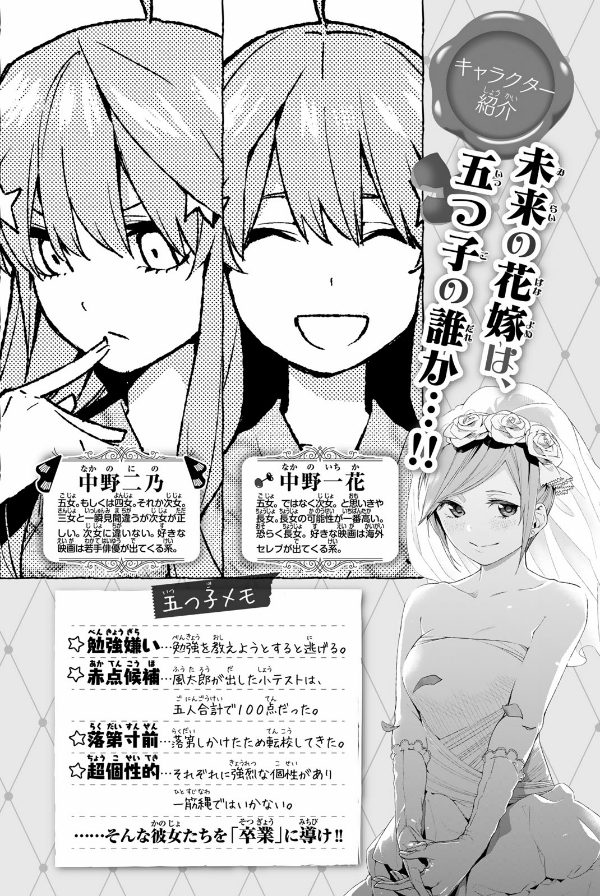 貧乏な生活を送る高校2年生・上杉風太郎のもとに、好条件の家庭教師アルバイトの話が舞い込む。ところが教え子はなんと同級生!! しかも五つ子だった!! 全員美少女、だけど「落第寸前」「勉強嫌い」の問題児! 風太郎は、超個性的な彼女たちを「卒業」まで導けるか──!?