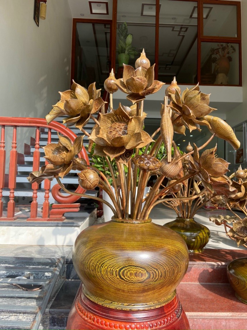 Bình hoa sen trang trí phòng thờ phòng khách ,phòng khách được làm bằng chất liệu gỗ mun đuôi công tự nhiên 100%  kt bình cắm hoa 23×37cm + kt 25 hoa lá cành gương cao tổng 85×70cm _ Bình hoa sen được tiện khắc thiết kế dáng bình phân khúc từ chân tới đầu vô cùng mềm mại và đẹp ,Kết hợp với sự sắp sếp hoa lá cành được làm hoàn toàn bằng tay thủ công ,được chỉnh sửa gọt sắc li ti tinh mỉ tinh sảo với độ trắc chắn chính xác cao .Đồng thời bình hoa sen được kiểm định kỹ lưỡng khắt khe ,như cho vào thẩm sấy cho gỗ khô kiệt .Mục đích trống dập nứt vênh mo mối mọt ,Kết hợp với trà nhám ,đánh giấy giáp nhiều lần ,sờ mát lạnh .Song rồi cho vào phun lót làm bóng mờ để giữ lại mầu sắc vân gỗ tự nhiên .Bình hoa sen được làm và hoàn thiện do bàn tay khối óc tài hoa .Từ những người thợ giàu kinh nghiệm ,Cũng như tay nghề cao trong làng nghề truyền thống .Chính vì thế bình hoa sen đã đáp ứng đầy đủ tất cả mọi tiêu trí ( Đẹp bền rẻ ) Thẩm mỹ nghệ thuật với chất lượng tuyệt vời