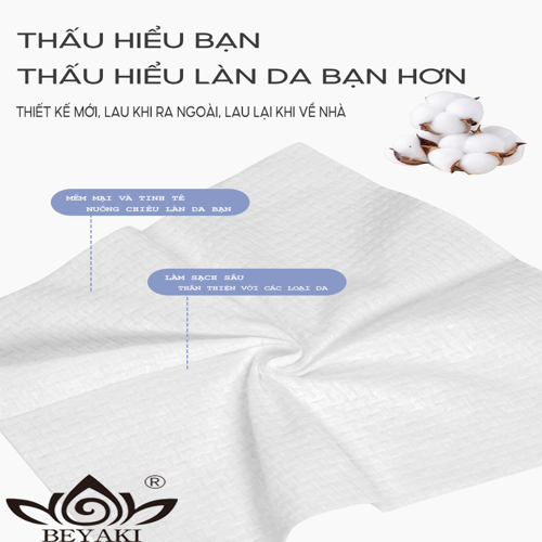 Thông Tin Sản Phẩm: • Thương hiệu: Beyaki (Việt Nam) • Số lượng: 50 tờ/gói - Kích thước 20x20cm mỗi tờ • Thành phần: 100% bông cotton tự nhiên • Made in PRC Tiện Ích