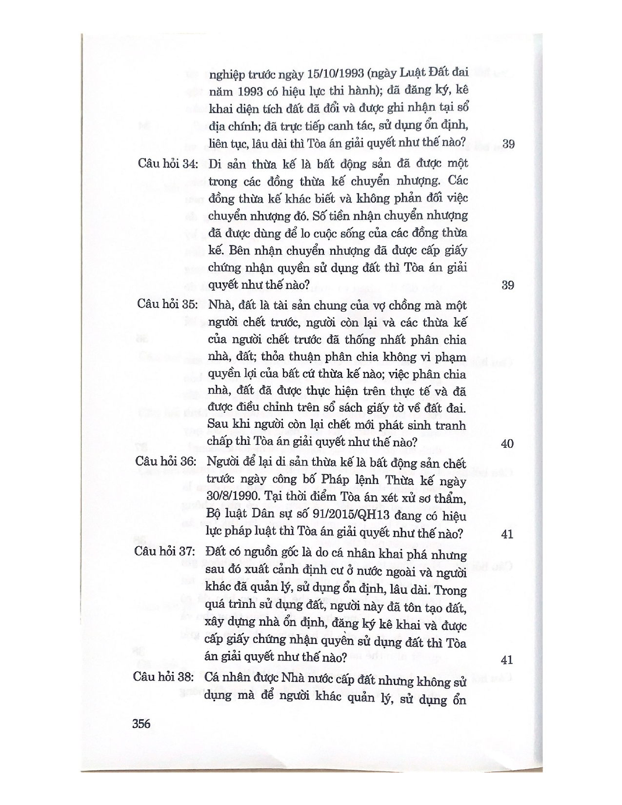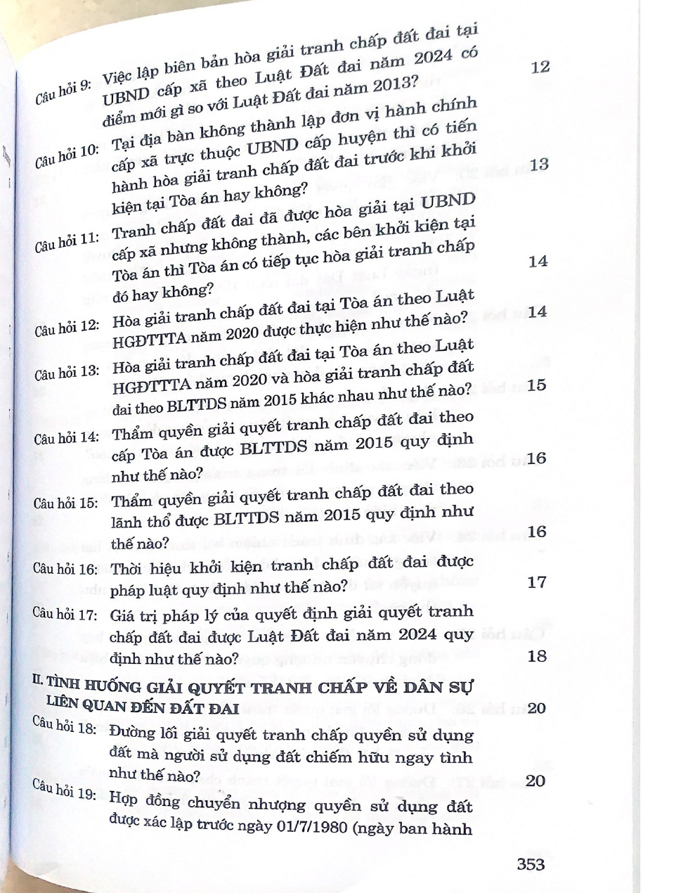 Sách- 100 câu hỏi giải quyết tranh chấp về đất đai tại Tòa án Tác giả: ThS.NCS. Tạ Đình Tuyên Nhà xuất bản: Nhà xuất bản Lao Động Ngày xuất bản: 8.2024 Công ty phát hành: Nhà sách Tư Pháp Sách khổ: 16x24 cm Số trang: 376 Giá bìa: 215.000 đ/1 cuốn  LỜI GIỚI THIỆU Ngày 18/01/2024, tại kỳ họp bất thường lần thứ năm, Quốc hội khoá XV đã thông qua Luật Đất đai năm 2024 (Luật số 31/2024/QH15) thay thế Luật Đất đai năm 2013. Luật Đất đai năm 2024 đã thể chế hóa đầy đủ, kịp thời các quan điểm, chủ trương của Đảng tại Nghị quyết Đại hội lần thứ XIII của Đảng, các nghị quyết, kết luận của Đảng về quản lý và sử dụng đất đai, đặc biệt là Nghị quyết số 18-NQ/TW ngày 16/6/2022 của Ban Chấp hành Trung ương Đảng khóa XIII về tiếp tục đổi mới, hoàn thiện thể chế, chính sách, nâng cao hiệu lực, hiệu quả quản lý và sử dụng đất, tạo động lực đưa nước ta trở thành nước phát triển có thu nhập cao. Việc ban hành Luật Đất đai năm 2024 nhằm hoàn thiện thể chế, chính sách về đất đai phù hợp với thể chế phát triển nền kinh tế thị trường định hướng xã hội chủ nghĩa; giải quyết tình trạng chồng chéo, mâu thuẫn trong các chính sách, pháp luật có liên quan đến đất đai. Luật Đất đai là luật quan trọng, tác động đến mọi mặt của đời sống kinh tế - xã hội, quốc phòng, an ninh, bảo vệ môi trường của đất nước; giữ vai trò trung tâm trong hệ thống pháp luật về đất đai, có mối quan hệ với nhiều quy định khác của hệ thống pháp luật. Chính vì vậy, việc tìm hiểu và áp dụng đúng các quy định của Luật Đất đai năm 2024 có ý nghĩa rất quan trọng. Trong bối cảnh đó, Nhà xuất bản Lao Động xuất bản cuốn “100 câu hỏi giải quyết tranh chấp về đất đai tại Tòa án” do ThS.NCS. Tạ Đình Tuyên biên soạn. Nội dung cuốn sách gồm 2 phần, phần thứ nhất bao gồm 100 câu hỏi và trả lời về giải quyết tranh chấp về đất đai tại Tòa án; phần thứ hai là quyết định của Hội đồng Thẩm phán  Tòa án nhân dân tối cao liên quan đến giải quyết tranh chấp về đất đai (năm 2023 - 2024).         5