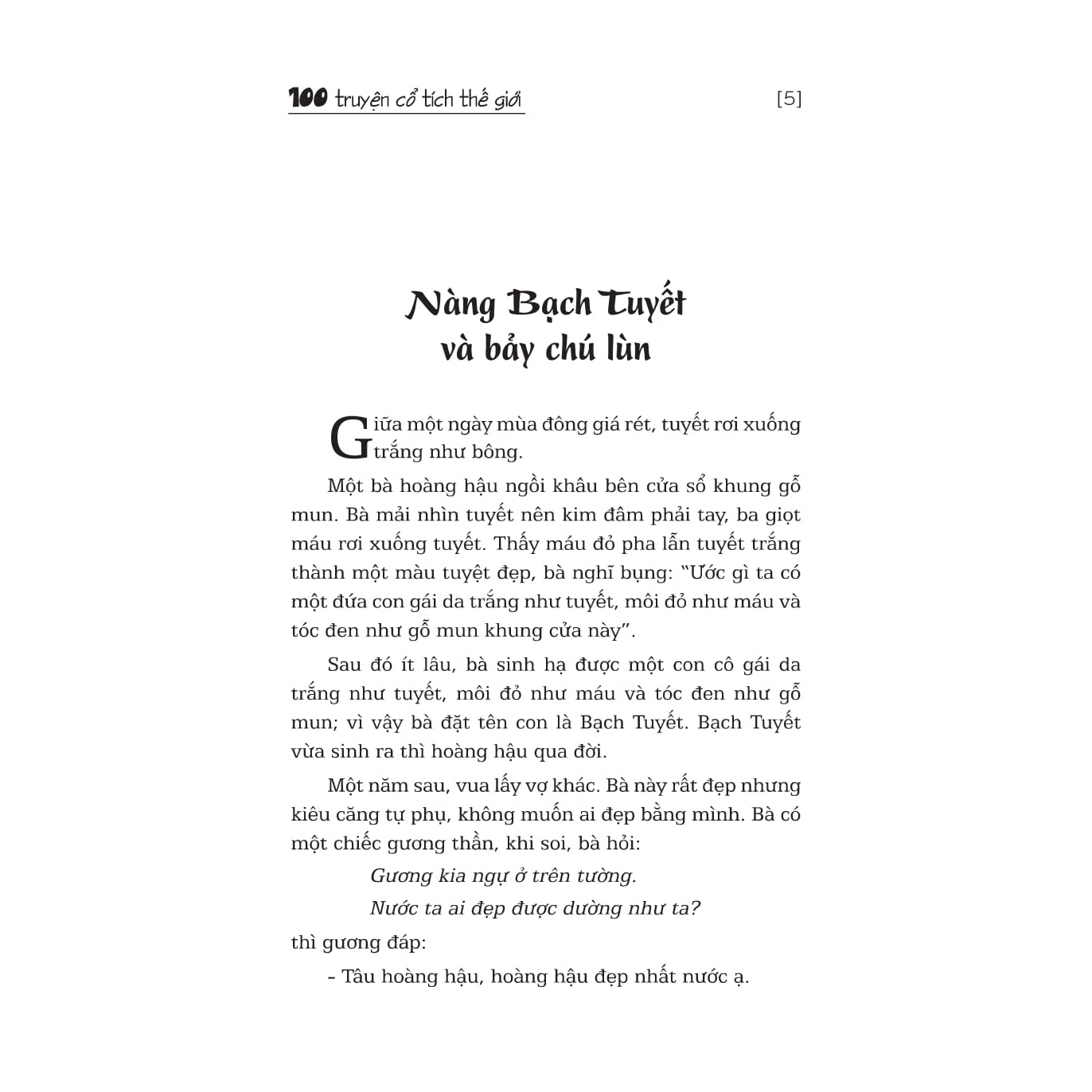 100 truyện cổ tích thế giới là tuyển tập những câu chuyện cổ tích hay nhất từ rất nhiều quốc gia trên thế giới. Cuốn sách sẽ dẫn các em bước vào một thế giới đầy màu sắc lung linh và diệu kỳ với nàng Bạch Tuyết, bảy chú lùn, cô bé lọ lem, với công chúa ngủ trong rừng, với những chàng hoàng tử, đến với những bữa tiệc, những bà tiên...