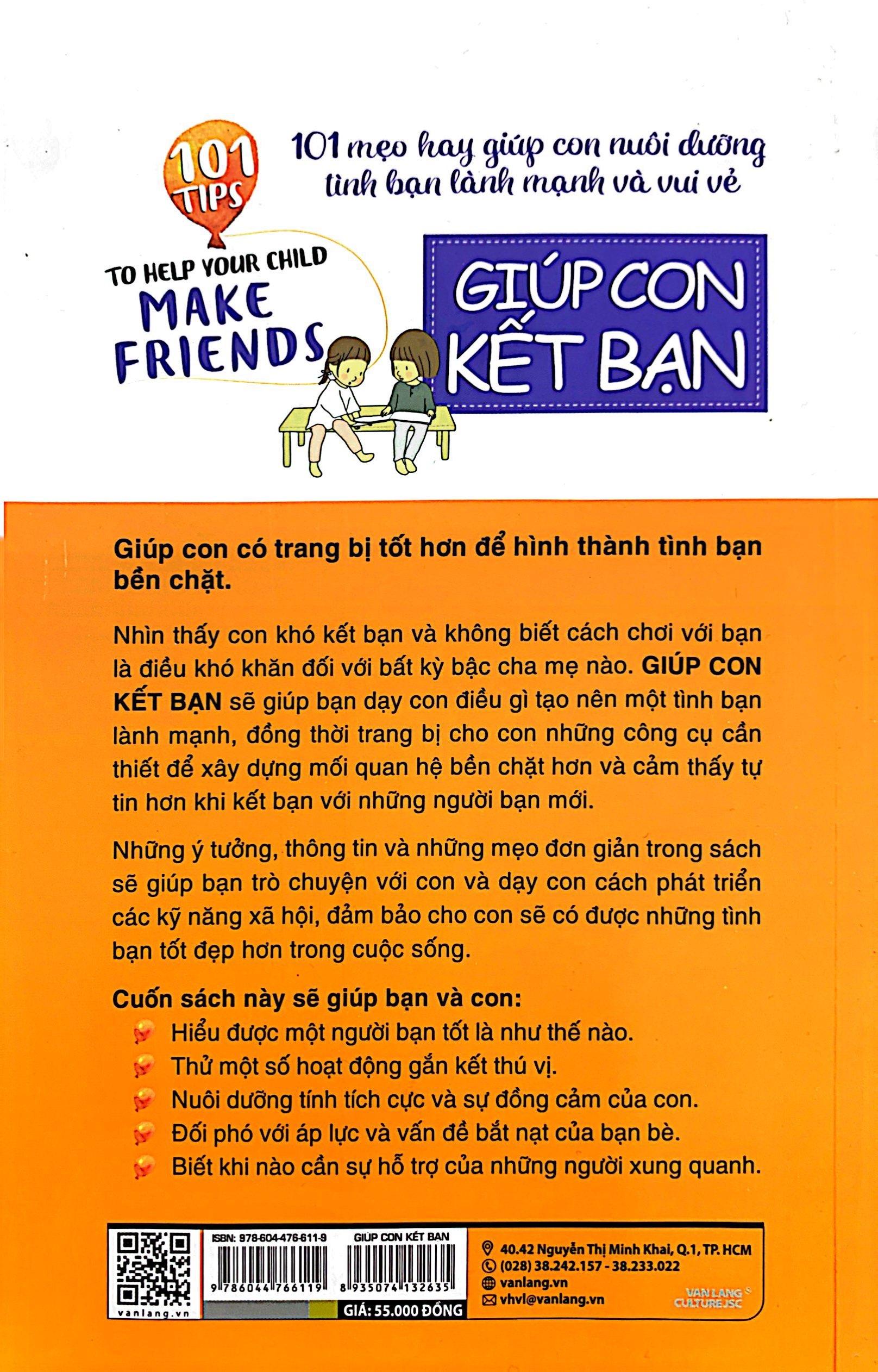 101 Tips - Giúp Con Kết Bạn Giúp con có trang bị tốt hơn để hình thành tình bạn bền chặt. Nhìn thấy con khó kết bạn và không biết cách chơi với bạn là điều khó khăn đối với bất kỳ bậc cha mẹ nào. 101 Tips - Giúp Con Kết Bạn sẽ giúp bạn dạy con điều gì tạo nên một tình bạn lành mạnh, đồng thời trang bị cho con những công cụ cần thiết để xây dựng mối quan hệ bền chặt hơn và cảm thấy tự tin hơn khi kết bạn với những người bạn mới. Những ý tưởng, thông tin và những mẹo đơn giản trong sách sẽ giúp bạn trò chuyện với con và dạy con cách phát triển các kỹ năng xã hội, đảm bảo cho con sẽ có được những tình bạn tốt đẹp hơn trong cuộc sống. Cuốn sách này sẽ giúp bạn và con: