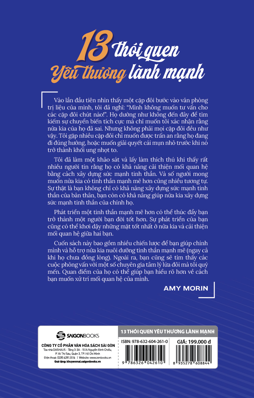 Không chỉ yêu – hãy yêu một cách mạnh mẽ và lành mạnh Có bao giờ bạn tự hỏi: Tại sao dù đã cố gắng hết mức, tình yêu vẫn dần nhạt phai? Có thể bạn đang chăm chỉ vun đắp bằng những điều nên làm – nhưng lại vô tình giữ lại những điều không nên làm. Trong cuốn 13 Thói Quen Yêu Thương Lành Mạnh, nhà trị liệu tâm lý Amy Morin – tác giả của 13 điều người có tinh thần thép không làm – đưa ra một hướng tiếp cận khác biệt: Loại bỏ những thói quen xấu đang âm thầm làm tổn thương tình yêu. Cuốn sách không dạy bạn cách yêu lý tưởng, mà hướng dẫn bạn trở thành phiên bản tốt hơn trong mối quan hệ thật sự – dù bạn đang hạnh phúc, đang bối rối, hay đang đứng giữa ranh giới tiếp tục hay dừng lại. Một cuốn sách chữa lành – và đồng hành thực tế Từ chương đầu tiên – “Không phớt lờ vấn đề” – đến chương cuối cùng – “Không ngừng phát triển và thay đổi”, mỗi phần trong sách đều mang tinh thần thực tế, thẳng thắn nhưng đầy cảm thông. Không lý thuyết suông, không sáo rỗng, Amy Morin viết bằng chính câu chuyện của mình – từ một người vợ hạnh phúc, trở thành góa phụ ở tuổi 26, và rồi học cách yêu lần nữa với tất cả sự trưởng thành, tổn thương và hy vọng. Bạn sẽ tìm thấy những mẫu chuyện đời thực, bài tập thực hành, câu hỏi tự phản tư, và cả lời khuyên từ các chuyên gia trị liệu hôn nhân. Dù bạn đọc một mình hay cùng người thương, cuốn sách luôn gợi mở một cách để bắt đầu một cuộc trò chuyện lành mạnh thay vì một cuộc tranh cãi mới. Cẩm nang cho những ai muốn yêu lâu – và yêu sâu 13 chương sách tương ứng với 13 “điều các cặp đôi tinh thần mạnh mẽ không làm” – chẳng hạn như: không phớt lờ vấn đề, không giao tiếp thiếu tôn trọng, không dùng cảm xúc làm vũ khí, không cố gắng sửa đổi nhau, không quên lý do bắt đầu,… Mỗi chương đều lồng ghép các tình huống thực tế, những câu hỏi phản tư, bài tập thực hành và lời khuyên chuyên môn từ các chuyên gia tâm lý trị liệu. Đặc biệt, cuốn sách khuyến khích người đọc tiếp cận một cách linh hoạt – bạn có thể đọc theo thứ tự, hoặc chọn đúng vấn đề mình đang đối diện và bắt đầu từ đó. Cuốn sách dành cho mọi ai đang có mối quan hệ – từ yêu đương đến hôn nhân – và muốn nó trở nên bền vững. Bạn sẽ nhận diện được các thói quen gây tổn hại như: giao tiếp thiếu tôn trọng, im lặng vì sợ mâu thuẫn, mong đợi người kia thay đổi theo ý mình... Không ai hoàn hảo, và tình yêu cũng không cần hoàn hảo – nhưng nếu đủ mạnh mẽ để nhìn lại chính mình, bạn sẽ đủ mạnh mẽ để thay đổi cả mối quan hệ. Theo khảo sát được Amy Morin thực hiện năm 2023 với hơn 1.000 cặp đôi, 86% người được hỏi cho biết họ mong muốn củng cố mối quan hệ – và phần lớn tin rằng điều đó khả thi nếu họ xây dựng được sức mạnh tinh thần. Cuốn sách này là một cẩm nang để bạn bắt đầu từ chính mình, bước đầu tiên để yêu một cách bền vững và đủ vững vàng cho cả hai. Dành cho những ai đang yêu, đã cưới, hoặc từng đau khổ vì tình yêu, “13 Thói Quen Yêu Thương Lành Mạnh” không phải là cuốn sách chỉ để đọc cho vui. Nó là hành trình nhận diện – chữa lành – phát triển, để mối quan hệ của bạn không chỉ tồn tại, mà thật sự tốt đẹp và đáng sống .