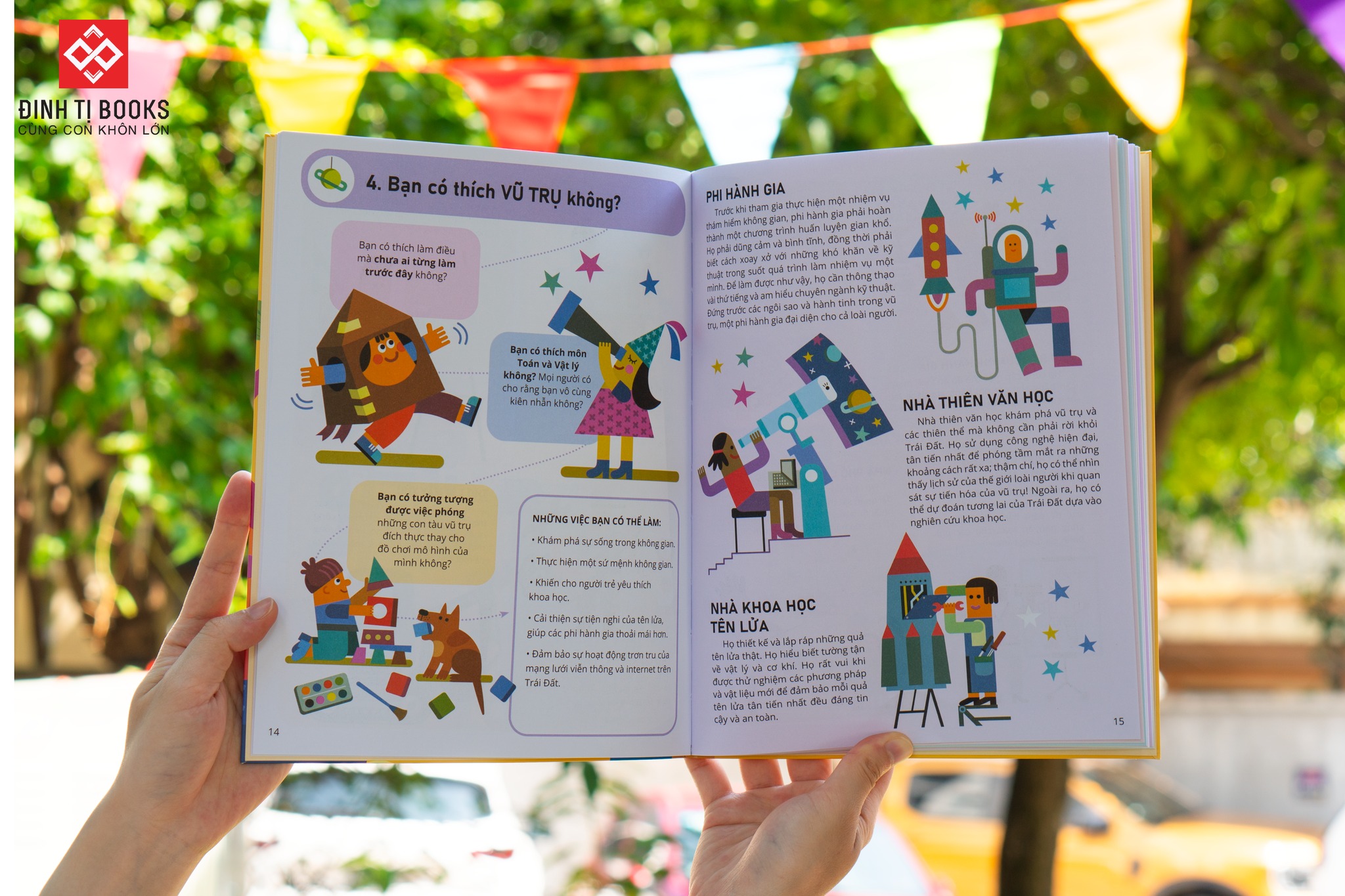 Cuốn sách này sẽ cung cấp những gợi ý về công việc phù hợp dựa trên sở thích và mong muốn của bản thân. Đồng thời đưa ra những mô tả tương đối chi tiết về công việc đó như bạn sẽ làm gì, cần kỹ năng gì để làm nó… Các bạn nhỏ sẽ rất dễ để hình dung và có nền tảng cơ bản về nghề nghiệp đó.