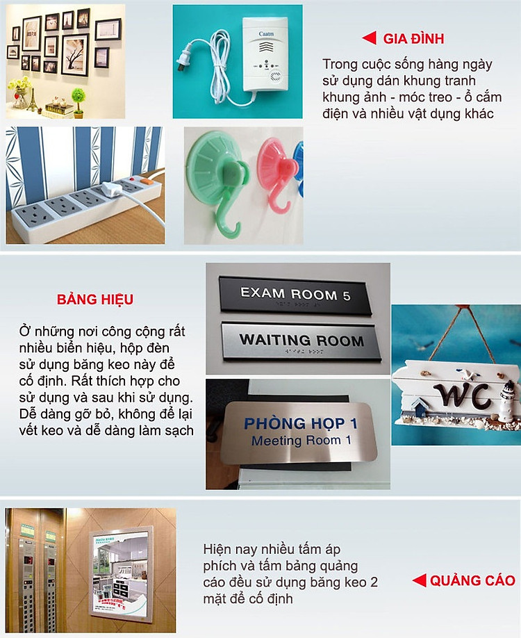 - Sử dụng keo dán acrylic cải tiến ở cả hai mặt, tạo độ bám dính tốt trên nhiều loại chất liệu bề mặt.