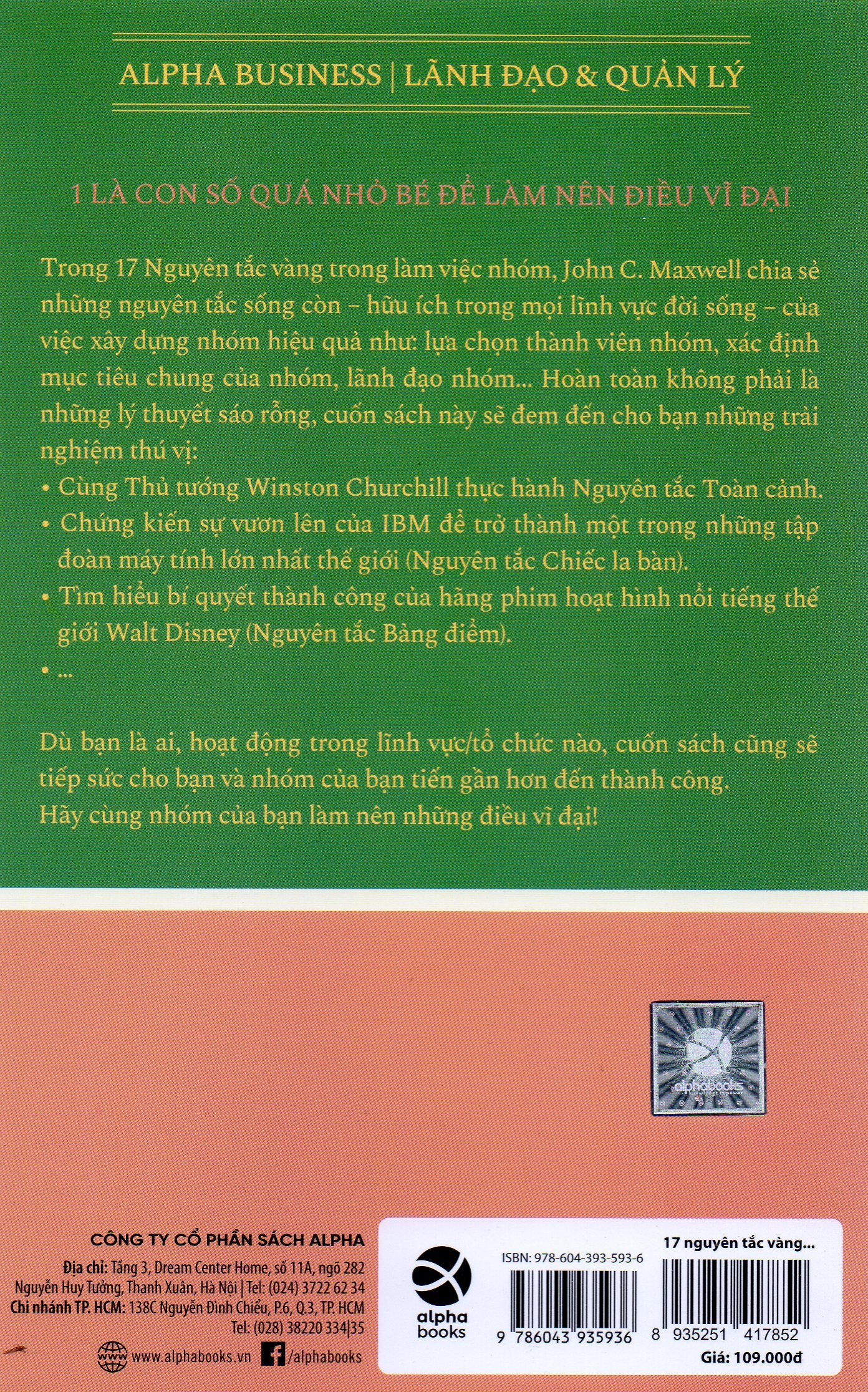 Trong 17 nguyên tắc vàng trong làm việc nhóm, John C. Maxwell chia sẻ những nguyên tắc sống còn – hữu ích trong mọi lĩnh vực đời sống – của việc xây dựng nhóm hiệu quả như: lựa chọn thành viên nhóm, xác định mục tiêu chung của nhóm, lãnh đạo nhóm… Hoàn toàn không phải là những lý thuyết sáo rỗng, cuốn sách này sẽ đem đến cho bạn những trải nghiệm thú vị: