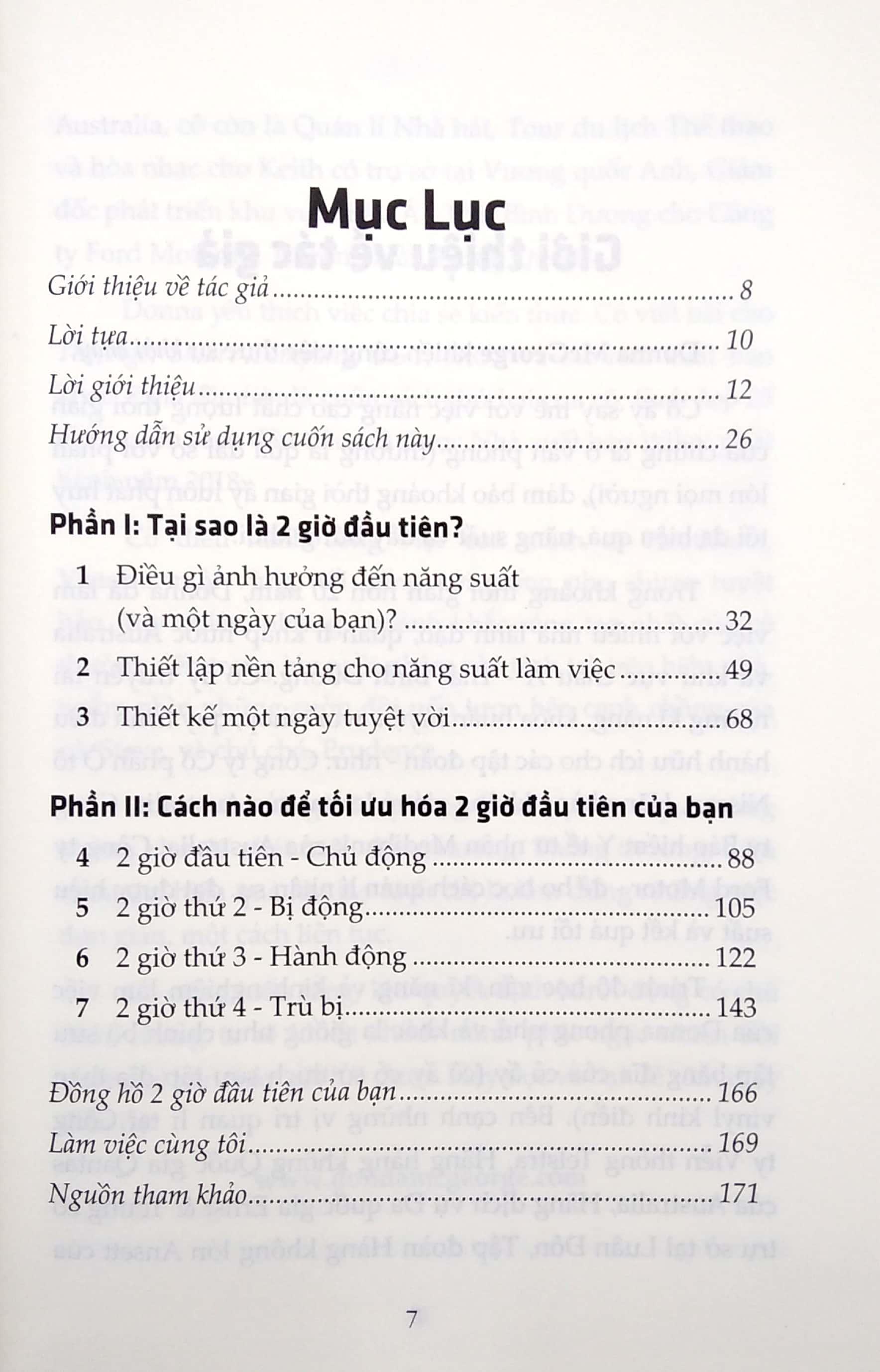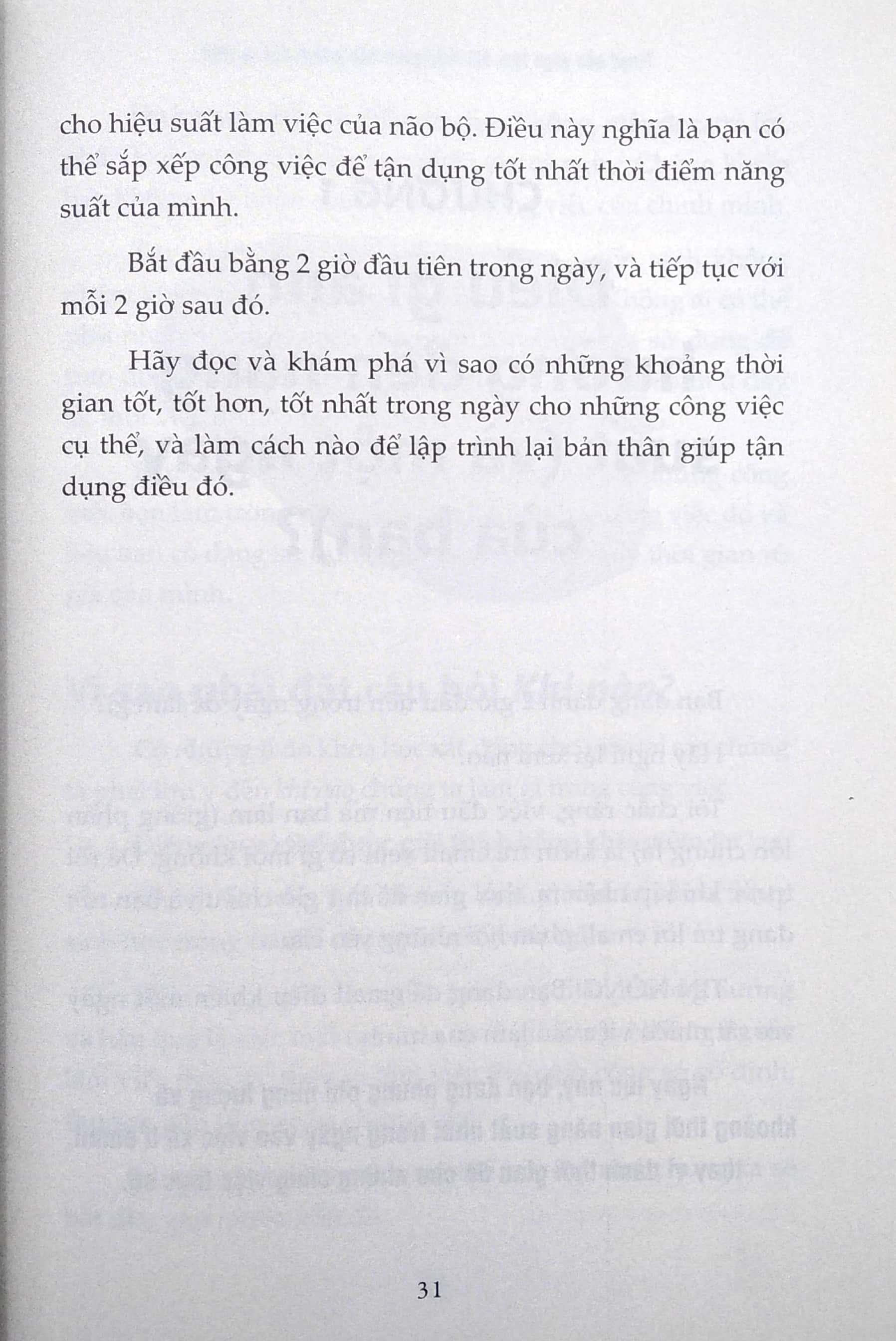"Hai giờ đầu tiên" chính là cuốn sách giúp bạn thiết kế một ngày làm việc hiệu quả dựa trên những nghiên cứu về thần kinh học, nguồn năng lượng tự nhiên của cơ thể, để phân chia thành các khối thời gian nằm trong khả năng quản lý, giúp bạn quyết định được khi nào bạn nhiều năng lượng nhất để dành thời gian đó hoàn thành những công việc thử thách nhất.