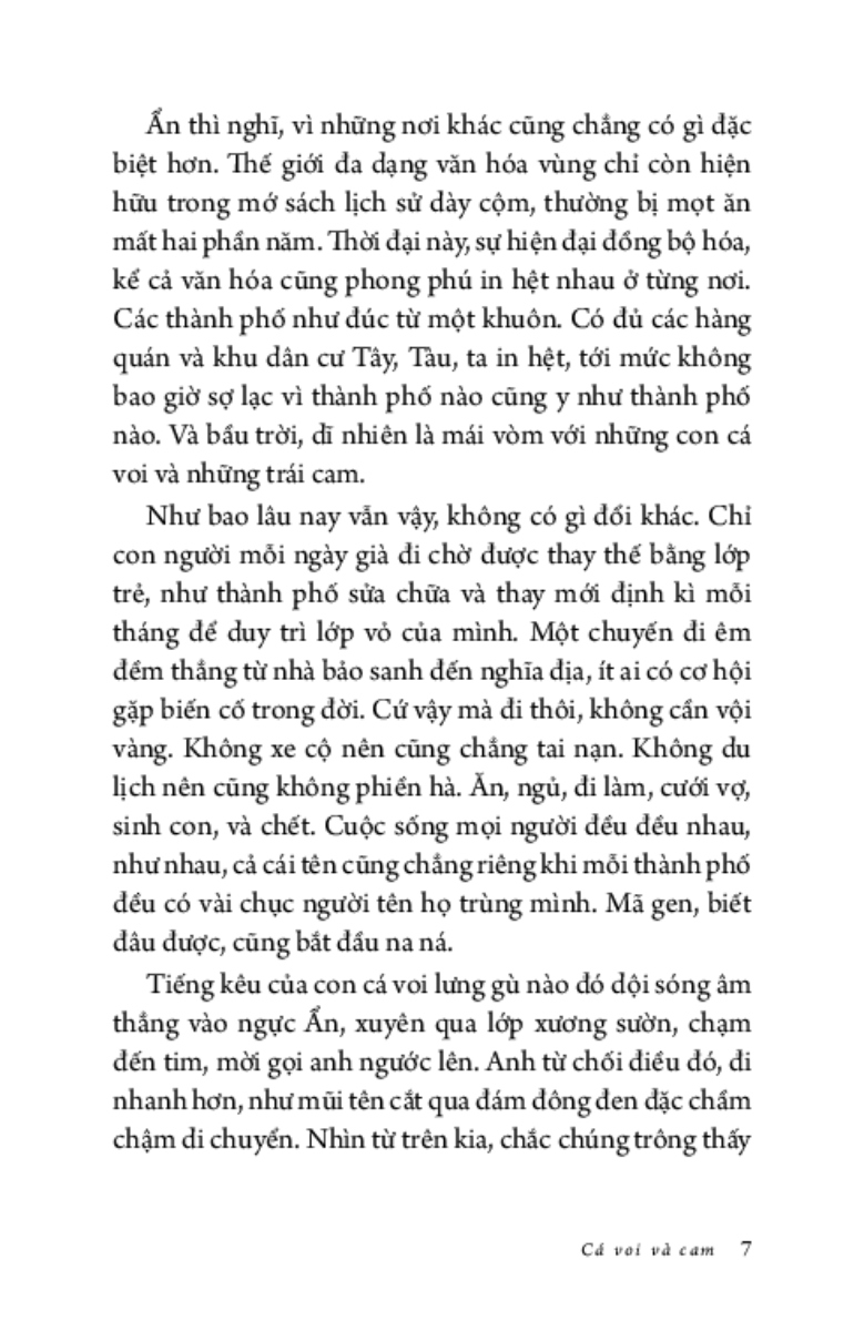 Ẩn không dám nhìn lên, anh chỉ muốn tránh bầu trời đẹp đẽ ấy, muốn nhanh nấp vào công ty để nhìn những trần nhà xám lạnh tẻ nhạt. Sự tẻ nhạt an toàn cố hữu, như triệu năm rồi vẫn vậy, có thể tìm thấy ở bất kì đâu trong kí ức: buồn chán và cứng ngắc. Còn hơn phải nhìn thấy bầy cá voi bơi giữa những trái cam, tất cả đều khổng lồ, tươi sáng và hiền hòa tới mức giả tạo.”