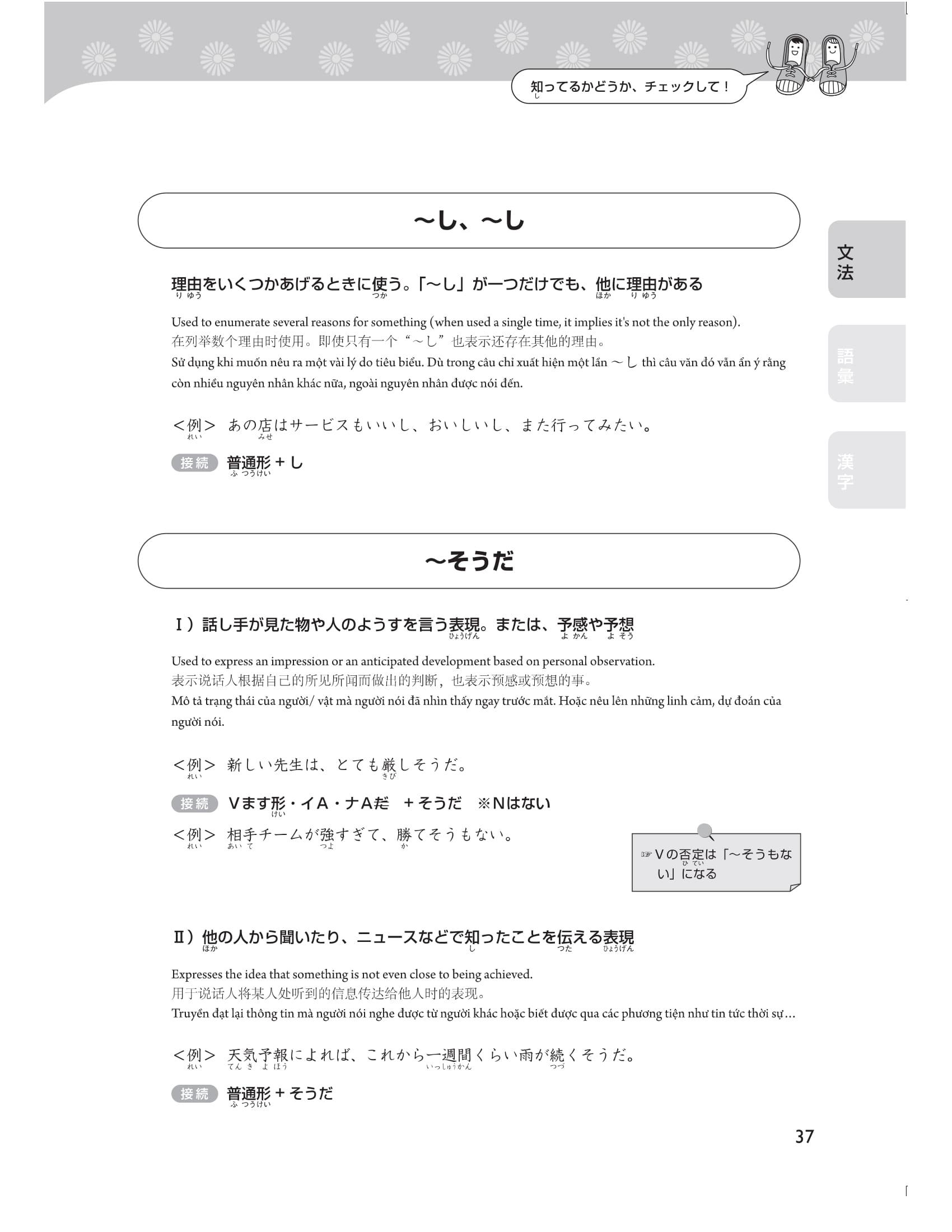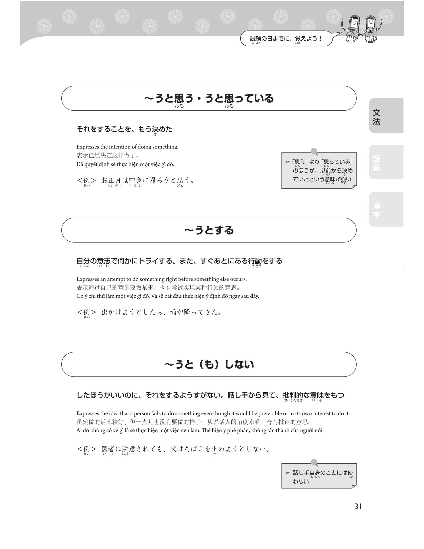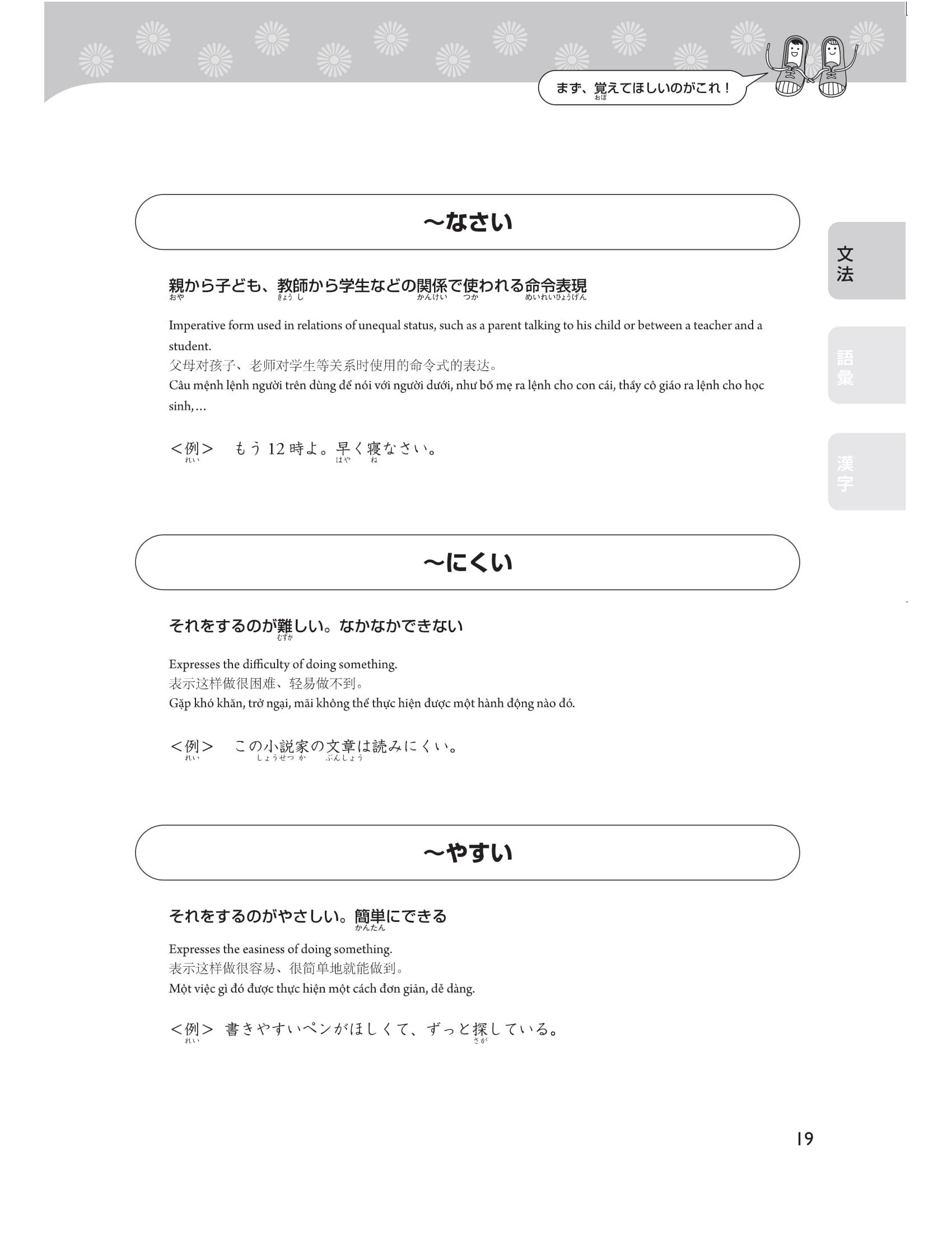 Để các bạn có thể luyện tập hiệu quả, ngoại trừ các chữ Hán thuộc cấp độ N5 thì tất cả các chữ Hán khác đều có furigana đi kèm nên các bạn vừa có thể kiểm tra được cách đọc của chữ Hán vừa có thể tăng tốc trong việc học. Sau khi nắm vững được các kiến thức trong cuốn sách này, các bạn hãy kiểm tra năng lực đọc hiểu của mình và phát huy khả năng đó trong phần thi nghe hiểu ở bài thi thật.