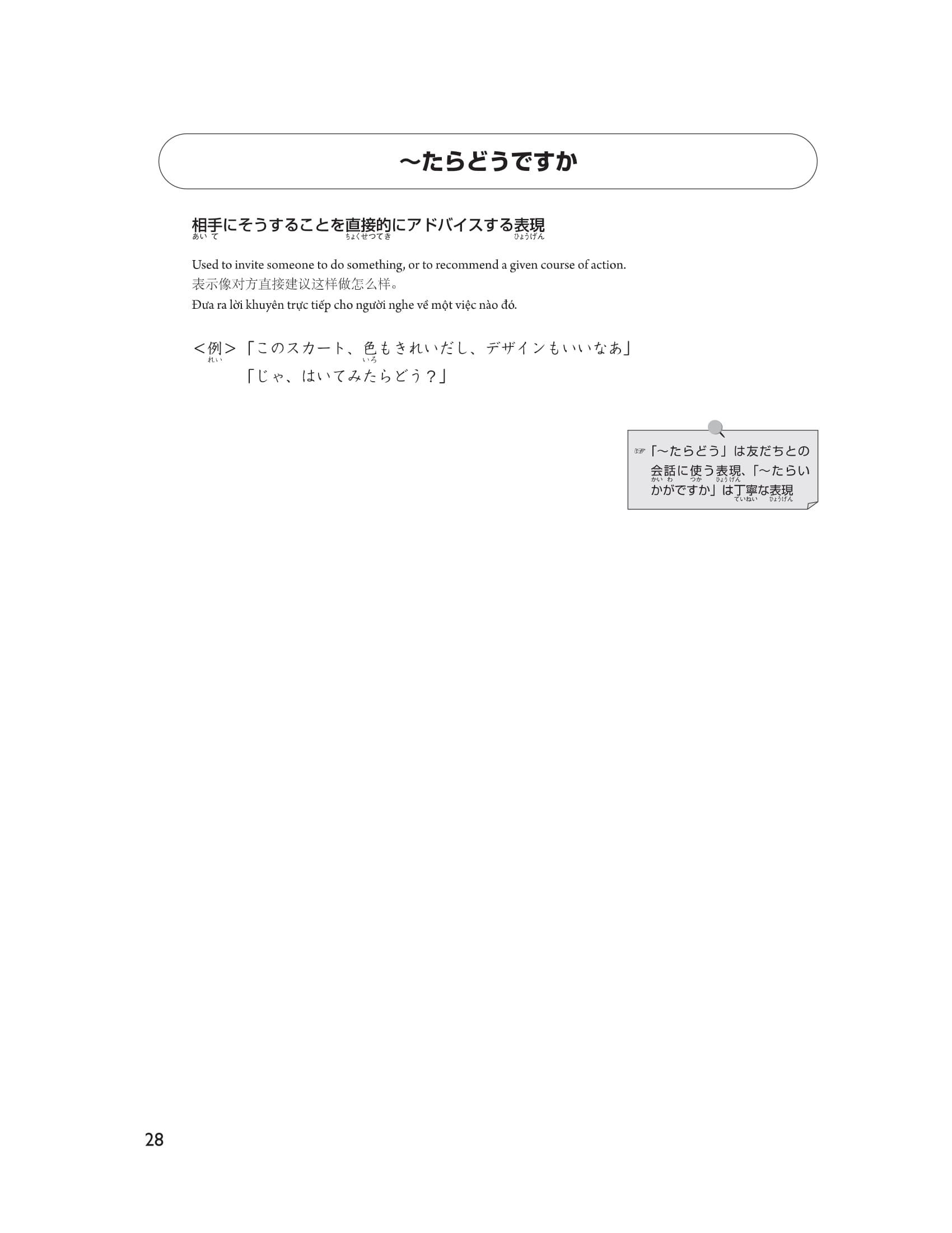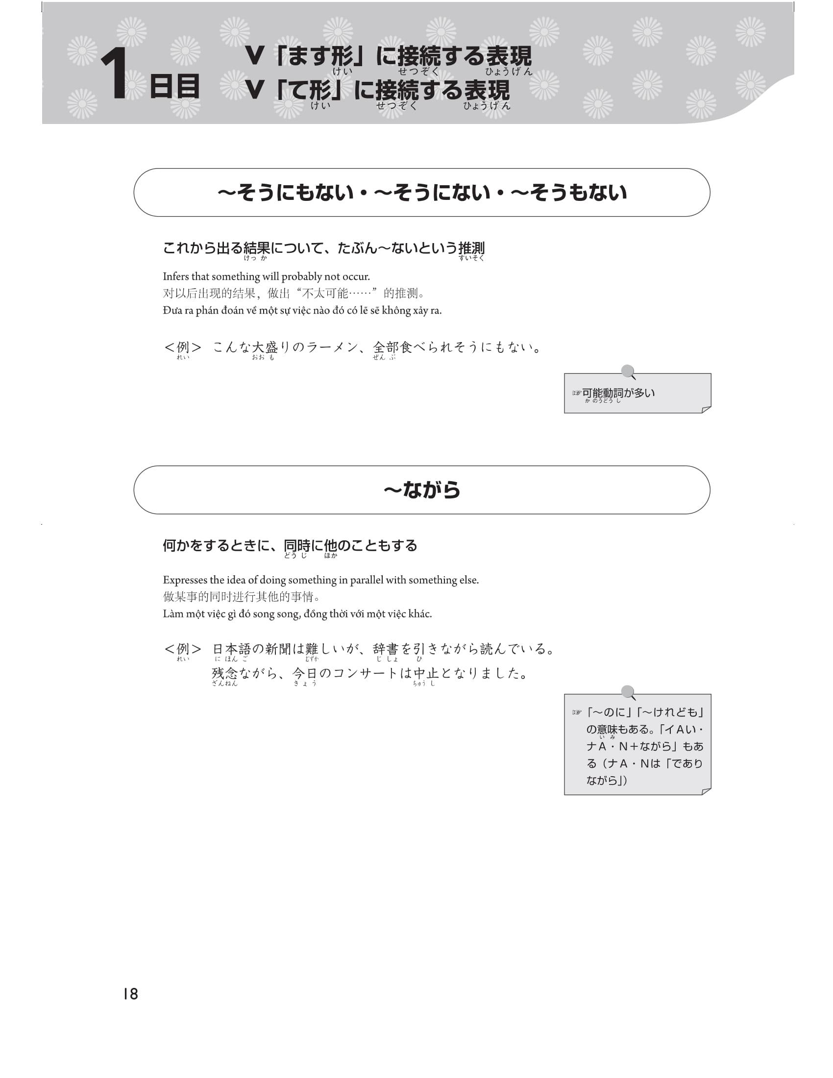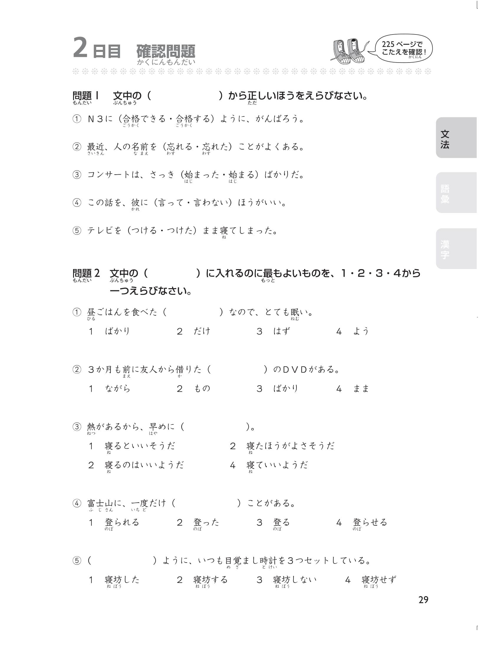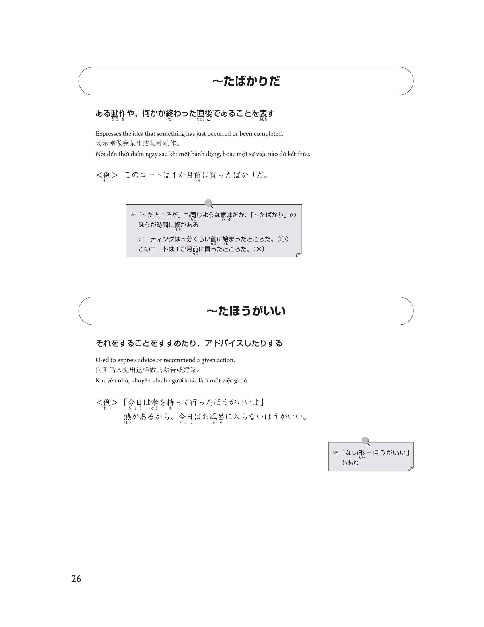 Để các bạn có thể luyện tập hiệu quả, ngoại trừ các chữ Hán thuộc cấp độ N5 thì tất cả các chữ Hán khác đều có furigana đi kèm nên các bạn vừa có thể kiểm tra được cách đọc của chữ Hán vừa có thể tăng tốc trong việc học. Sau khi nắm vững được các kiến thức trong cuốn sách này, các bạn hãy kiểm tra năng lực đọc hiểu của mình và phát huy khả năng đó trong phần thi nghe hiểu ở bài thi thật.