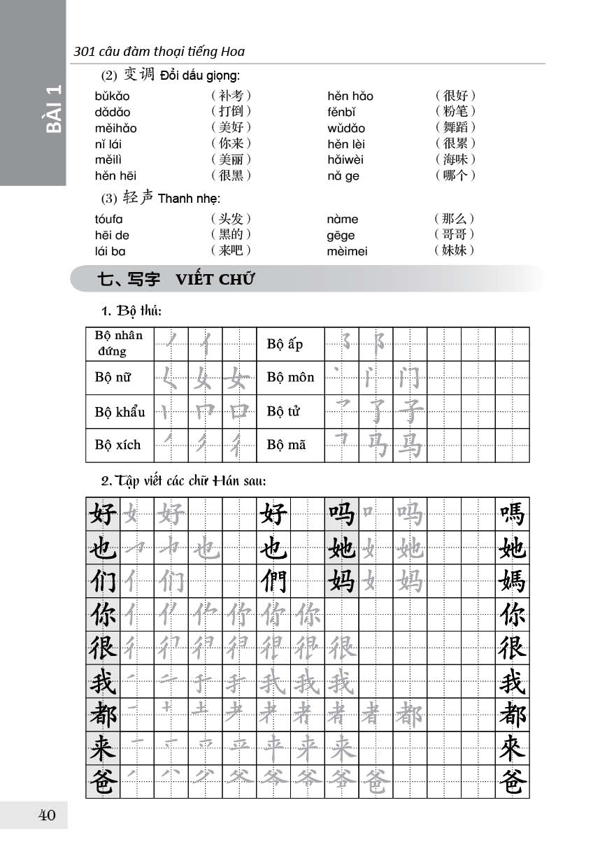 Để giúp người học khắc phục khó khăn nói trên, trong lần dịch lại cuốn sách này, ngoài việc tôn trọng nguyên vẹn nội dung của tài liệu gốc, chúng tôi có thêm một phần giới thiệu ngữ âm tiếng Hoa, chữ Hoa. Sau mỗi bài, chúng tôi bổ sung thêm một bài tập viết các chữ Hoa mới xuất hiện trong bài và bài tập luyện dịch Việt – Hoa.