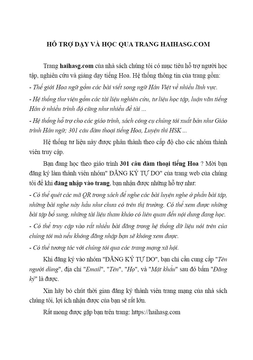 Hiện nay rất nhiều khoa, trường, trung tâm ngoại ngữ sử dụng cuốn “301 câu đàm thoại tiếng Hoa” của Học Viện Ngôn ngữ Bắc Kinh Trung Quốc làm tài liệu dạy và học tiếng Hoa giai đoạn cơ sở. Sự lựa chọn trên là hoàn toàn chính xác. Cuốn “301 câu đàm thoại tiếng Hoa” tuy chỉ có 40 bài và bài ôn tập, nhưng đã đề cập đến nhiều đề tài giao tiếp thông thường trong đời sống. Ngôn ngữ trong các bài đó ngắn gọn, trong sáng, mang tính khẩu ngữ rất cao. Hệ thống các điểm ngữ pháp tập trung vào các đặc điểm ngữ pháp tiếng Hoa, hệ thống bài tập đa dạng phong phú, dễ hiểu, dễ luyện tập.