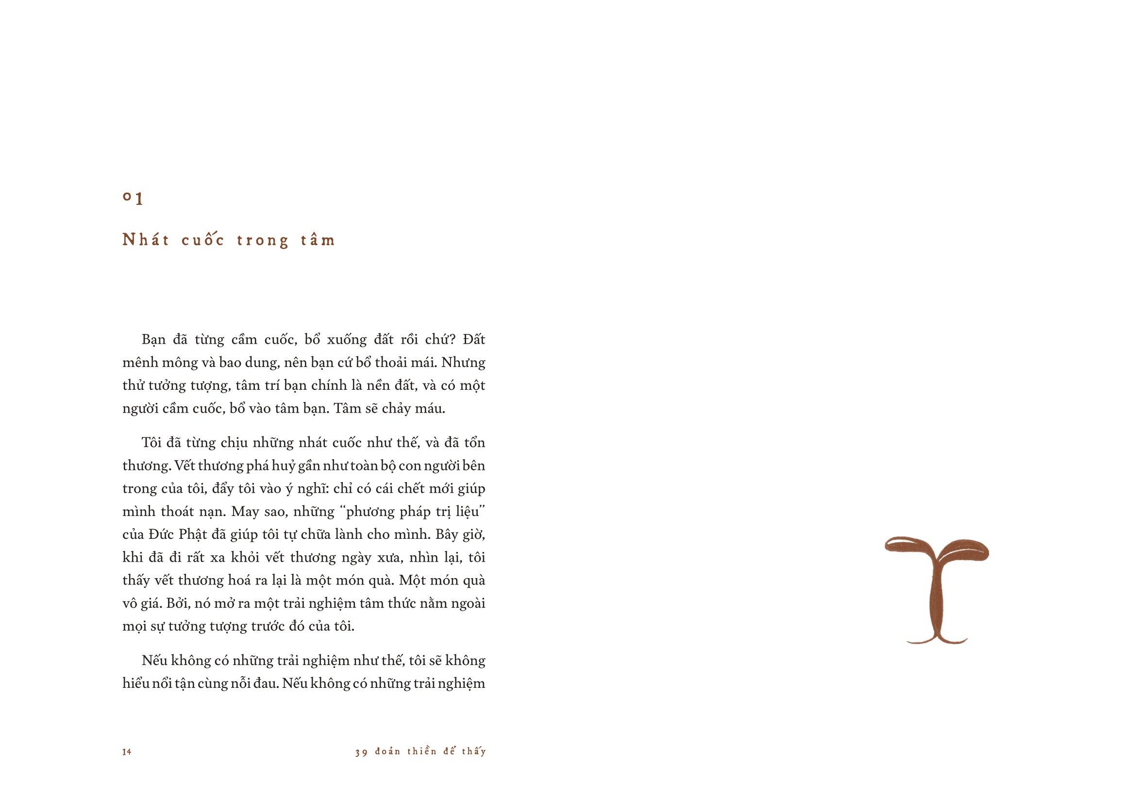Là những đoản văn, ghi lại cảm nhận của tác giả bằng con mắt thiền, 39 Đoản Thiền Để Thấy - Những Câu Chuyện Chữa Lành là những suy tư tưởng chừng vụn vặt, nhưng đầy sâu lắng về cuộc đời và con người. Mặc dù tác giả sử dụng giọng viết rất giản dị, khiêm nhường, nhưng bạn đọc vẫn có thể nhận được ở đây những triết lí sâu sắc, những bài học mới mẻ về cuộc đời, phát hiện ra những điều vĩ đại đằng sau những cái đời thường, để sống bình tĩnh hơn, cảm nhận cuộc sống đầy đủ và trọn vẹn hơn.