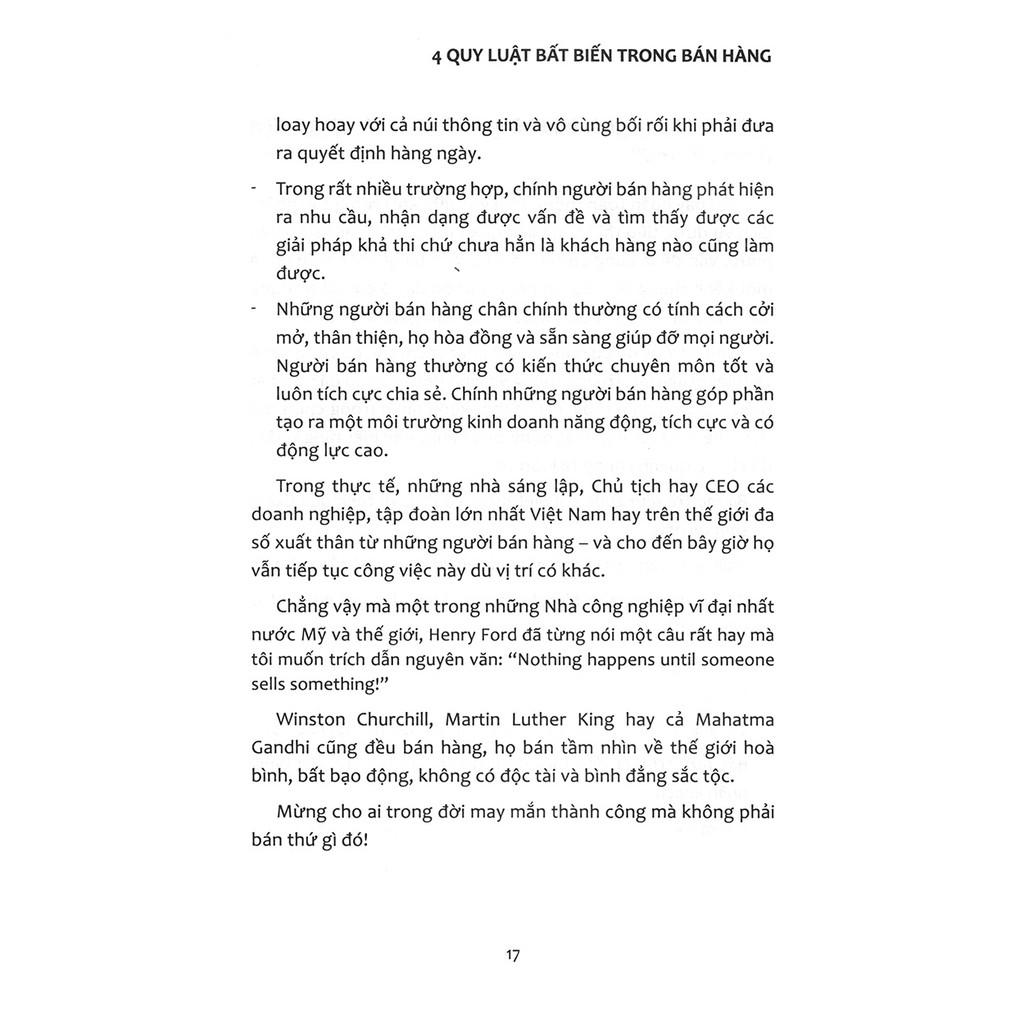 MÔ TẢ SẢN PHẨM 4 Quy Luật Bất Biến Trong Bán Hàng - 100 Câu Chuyện Cảm Hứng Về Nghệ Thuật Bán Hàng Đỉnh Cao Ai là Người bán hàng vĩ đại nhất thế giới mọi thời đại? Ai được vinh danh là Người bán hàng xuất sắc nhất Châu Á? Em bé được xem là bán hàng giỏi nhất Sapa? Người bán bảo hiểm xuất sắc nước Mỹ? Người phụ nữ nào được mệnh danh là “Nữ Hoàng Môi Giới”? Lời chào hàng cho Tổng thống sẽ thế nào? Tại sao bang Alaska được mua lại từ Đế chế Nga chỉ có giá 7,2 triệu đôla mà bị nhiều người Mỹ chê là thỏa thuận điên rồ? Hoặc nếu Tổng thống Abraham Lincohn là người quản lý bán hàng thì sao? Đây là cuốn sách nói về bán hàng và dành cho những ai có liên quan nhưng chẳng giống với bất kỳ cuốn sách bán hàng nào đã được xuất bản. Phương pháp, kỹ thuật và các quy trình bán hàng không được trình bày hay diễn giải chi tiết – thay vào đó, chỉ là những câu chuyện kể. Vâng! Tôi chọn kể lại những câu chuyện với mong muốn duy nhất là mang lại nguồn cảm hứng giúp bạn thêm yêu thích công việc, có thêm nhiều động lực và củng cố thêm suy nghĩ lạc quan về nghề bán hàng mà bạn chọn đeo đuổi. Từ kinh nghiệm đào tạo nhiều năm qua, tôi thấy rằng các bạn có thể rất chóng quên các lý thuyết về phương pháp nhưng lại nhớ rất kỹ những câu chuyện được kể. Anh chàng bảo vệ bán hàng quái kiệt; chị Hoà bán vé số; cậu bé cắt cỏ; em gái ở cửa hàng KFC hay tiệm bánh mì ‘Madam Khanh’ là những câu chuyện được các bạn tâm đắc và tìm thấy nhiều cảm hứng. Đó là lý do khuyến khích tôi tập hợp tất cả lại để thực hiện cuốn sách “4 Quy luật bất biến trong bán hàng - #100 câu chuyện cảm hứng về nghệ thuật bán hàng đỉnh cao” này. Những câu chuyện trong sách một phần cũng được tôi chia sẻ trong 3 tác phẩm đã phát hành, phần khác thỉnh thoảng được đăng trên trang blog cá nhân. Toàn bộ 100 câu chuyện đều có liên quan đến việc bán hàng, quản lý bán hàng hay về dịch vụ khách hàng – là các chủ đề mà tôi rất quan tâm và yêu thích. Do là tính chất kể chuyện nên chúng không được sắp xếp và trình bày theo thứ tự cụ thể nào - hy vọng bạn tìm thấy được thông điệp ý nghĩa theo cảm nhận của riêng mình đối với mỗi câu chuyện. Các mẩu chuyện trong cuốn sách này một phần từ trải nghiệm cá nhân, phần khác tôi nghe kể lại hoặc đọc sách, báo và các nguồn khác nhau. Đó có thể là những mẫu tin hay mảnh tư liệu lịch sử quen thuộc – nhưng dưới góc nhìn của một người bán hàng lại thấy ra nhiều bài học thú vị.