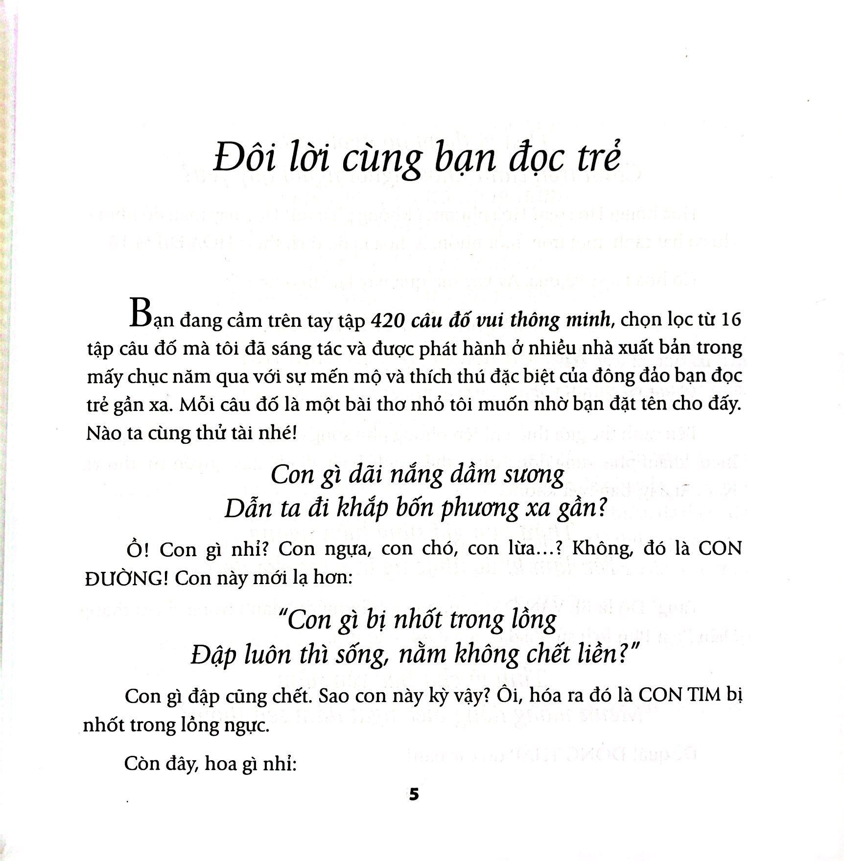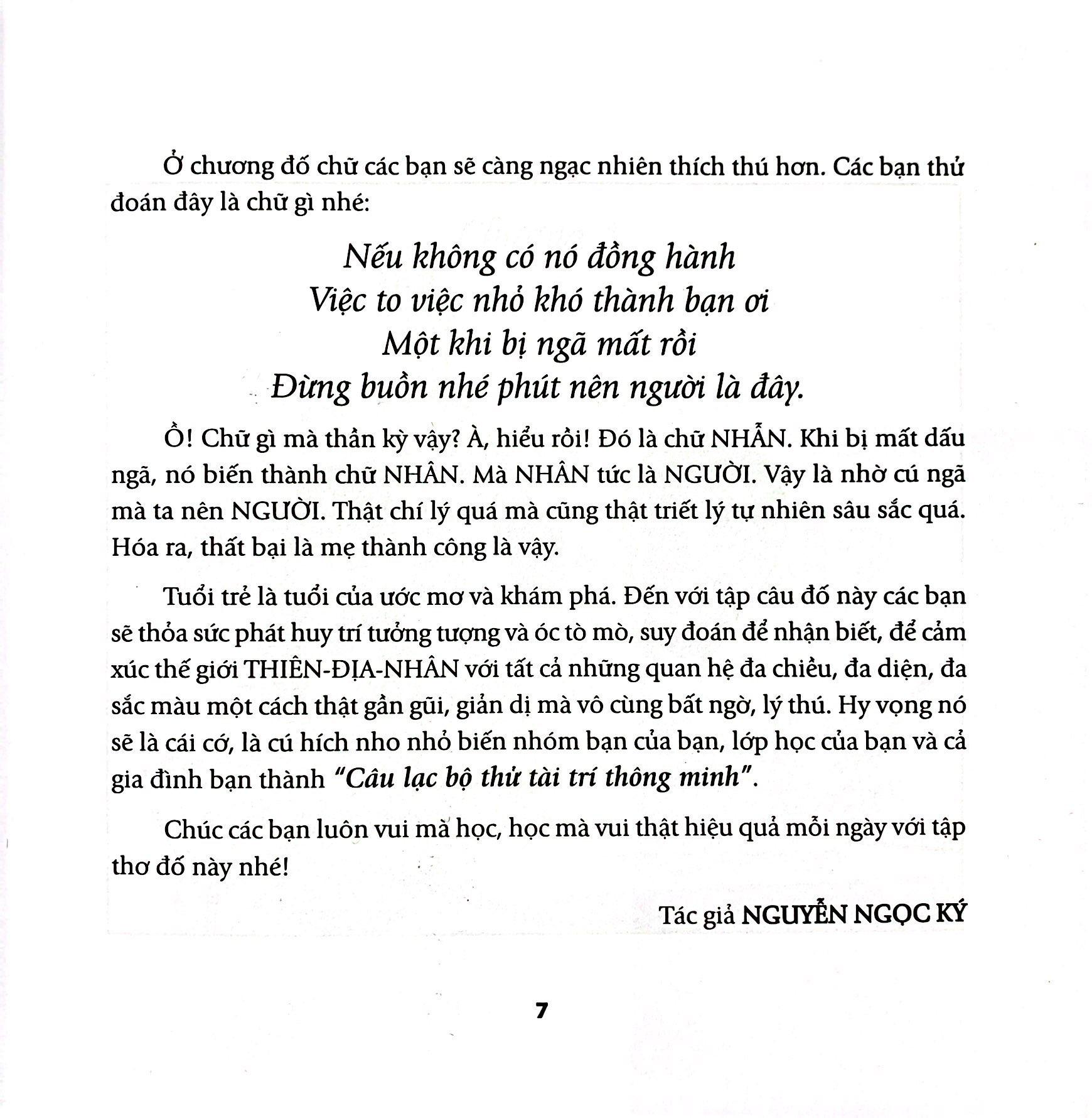 Nhà giáo Nguyễn Ngọc Ký gửi gắm: “Tuổi trẻ là tuổi của ước mơ và khám phá. Đến với tập câu đố này các bạn sẽ thỏa sức phát huy trí tưởng tượng và óc tò mò, suy đoán để nhận biết, để cảm xúc thế giới THIÊN-ĐỊA-NHÂN với tất cả những quan hệ đa chiều, đa diện, đa sắc màu một cách thật gần gũi, giản dị mà vô cùng bất ngờ, lý thú”. Đa số các câu đố trong 420 câu đố vui thông minh đều sử dụng thể thơ lục bát, chỉn chu về vần điệu giúp các em dễ đọc và dễ thuộc. Nhà giáo Nguyễn Ngọc Ký hy vọng đây sẽ là cái cớ, là cú hích nho nhỏ để các em học sinh, các lớp học hay mỗi gia đình nhỏ trên khắp cả nước hình thành nên “Câu lạc bộ thử tài trí thông minh”, cùng tham gia vui đố để vừa có thể chơi vừa tìm hiểu kiến thức phong phú trong cuộc sống.