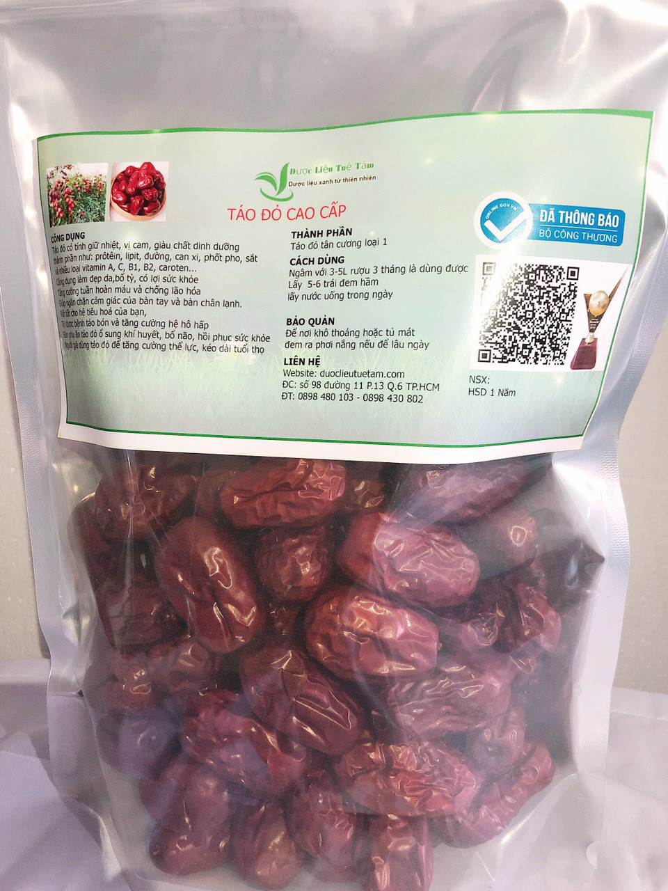 - Với những người nghiện trà, mỗi tối tránh mất ngủ, dùng canh táo đỏ thay trà Vườn táo đỏ khi chín Vào mùa thu và mùa xuân, thời tiết lúc ấm lúc lạnh, ta dùng canh lá dâu thêm quả táo đỏ uống thay trà để tránh cảm cúm, thương hàn. Vào mùa hạ, thời tiết nóng nực, dùng canh lá sen và táo đỏ để giải nhiệt. Vào mùa đông, thời tiết lạnh căm, có thể dùng canh táo đỏ và gừng giữ ấm dạ dày. Táo đỏ khô còn có tác dụng: bổ máu, bổ can thận, bổ tinh, thông tiện, giải độc, làm bổ trung khí Táo đỏ đóng gói cao cấp Thông tin về sản phẩm Tên sản phẩm: táo đỏ tân cương loại Nguồn gốc: tân cương Ngày sản xuất: ghi trên bao bì Hạn sử dụng: 1 năm Mùi vị: Vị ngọt, tính mát dễ uống Đóng gói túi zip: 1kg cao cấp Bảo quản: Nơi thoáng mát, khô ráo Hướng dẩn sử dụng Dùng để ăn luôn, nấu nước hoặc ngâm rựu đều được TÁO ĐỎ CỦA TUỆ TÂM Được lựa chọn tử nhửng quả táo to chín tự nhiên đem lại hương thơm và vị ngọt của hương trời Táo dỏ được sấy khô và bảo quản một cách tự nhiên không làm mất đi chất sinh dưởng có trong quả táo Sản phẩm được kiểm định nghiêm ngặt về chất lượng và mùi vị Luôn mang tới cho quý khách hàng những quả táo chín thơm hoàn hảo