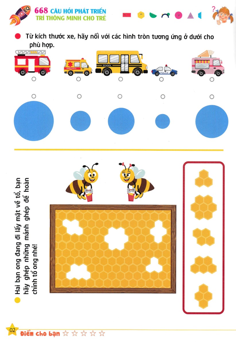 668 Câu Hỏi Phát Triển Trí Thông Minh Cho Trẻ - Tập 4 Bộ sách 668 Câu Hỏi Phát Triển Trí Thông Minh Cho Trẻ nhằm phát triển IQ,EQ, Cung cấp những trò chơi toán học úp trẻ phát huy tối đa khả năng nhận thức, tư duy phân kỳ, tưởng tượng, tri giác về không gian, phán đoán, suy luận và thông minh cảm xúc giúp trẻ rèn luyện tư duy một cách toàn diện. Nhiều bài trong bộ sách được trang bị để có sự tương tác giữa bố mẹ và con cái, vừa nân cao năng lực tuy duy của mình vừa giúp trẻ phát triển các kỹ năng tư duy cần thiết để trẻ xây dựng kỹ năng, sự khéo léo, tính chính xác và rèn luyện độ kiên trì