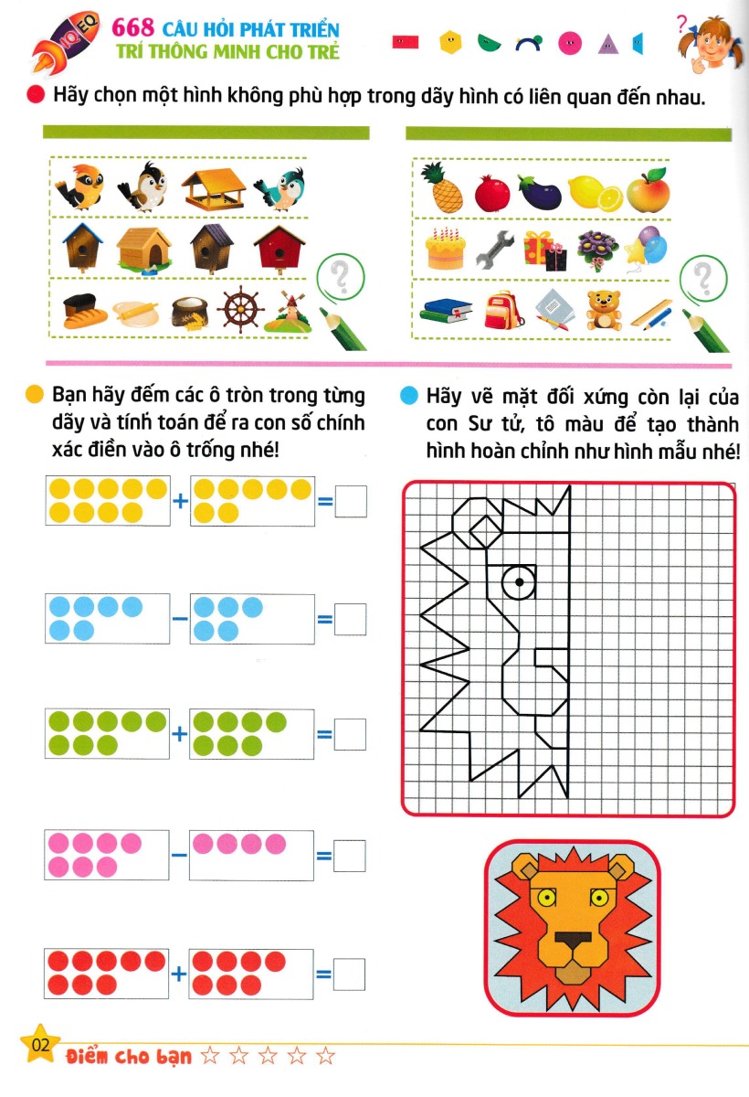 Mua tại Tiktok668 Câu Hỏi Phát Triển Trí Thông Minh Cho Trẻ - Tập 5 Bộ sách 668 Câu Hỏi Phát Triển Trí Thông Minh Cho Trẻ nhằm phát triển IQ,EQ, Cung cấp những trò chơi toán học úp trẻ phát huy tối đa khả năng nhận thức, tư duy phân kỳ, tưởng tượng, tri giác về không gian, phán đoán, suy luận và thông minh cảm xúc giúp trẻ rèn luyện tư duy một cách toàn diện. Nhiều bài trong bộ sách được trang bị để có sự tương tác giữa bố mẹ và con cái, vừa nân cao năng lực tuy duy của mình vừa giúp trẻ phát triển các kỹ năng tư duy cần thiết để trẻ xây dựng kỹ năng, sự khéo léo, tính chính xác và rèn luyện độ kiên trì