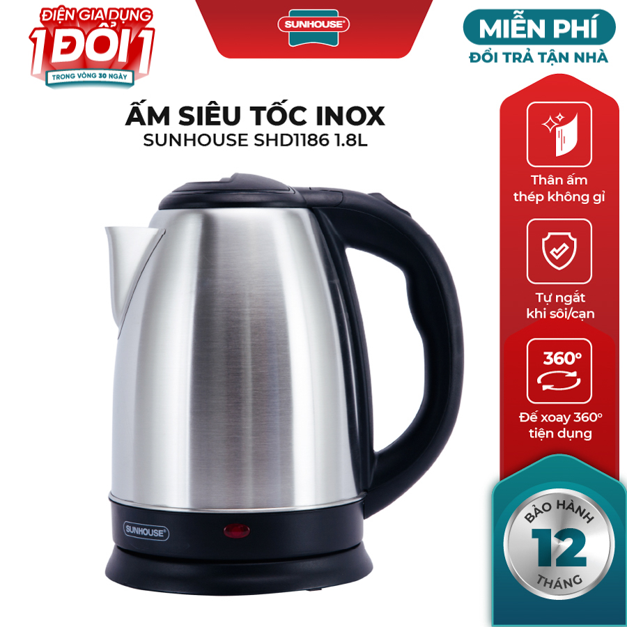 Ấm Siêu Tốc Inox Sunhouse SHD1186 - 1.8L (Bạc) có thân bình được làm bằng inox không gỉ đảm bảo vệ sinh cho nguồn nước. Đồng thời chất liệu sáng bóng, dễ dàng chùi rửa và mang lại độ bền bỉ cho quá trình sử dụng.