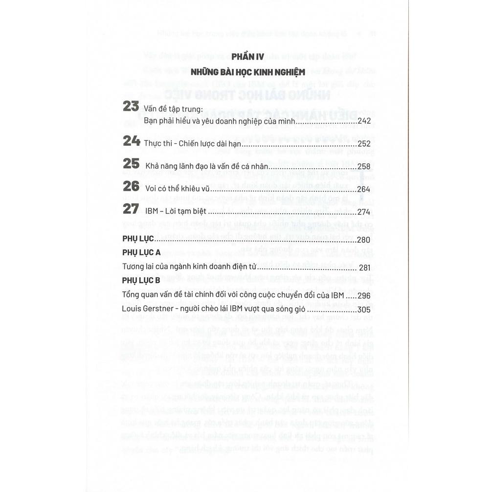 gian, Gerstner vạch ra những lý do phía sau văn hóa lỗi thời của IBM, những sai lầm về cách làm việc trong cạnh tranh cao độ vào cuối thế kỷ 20 và những quyết định, chiến lược mà IBM đã quay trở lại vị trí dẫn đầu.