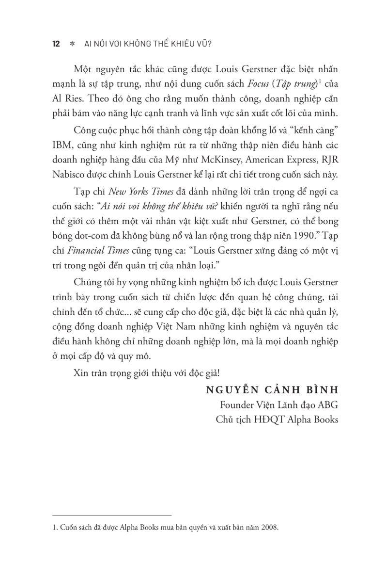 Ai nói voi không thể khiêu vũ? là bản tóm tắt những thành công đáng ngưỡng mộ của Louis Gerstner trong công cuộc phục hồi thành công tập đoàn khổng lồ và “kềnh càng” IBM. Ngày nay, những kinh nghiệm quản lý và điều hành của Louis Gerstner sau nhiều năm làm việc tại những công ty hàng đầu nước Mỹ – McKinsey, American Express, RJR Nabisco – vẫn luôn là bài học quý giá cho tất cả mọi công ty, ở mọi cấp độ quy mô trên toàn cầu.