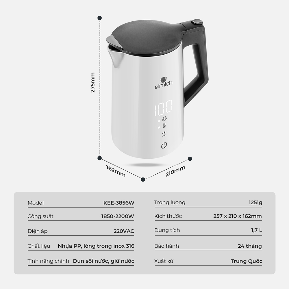 ✨Ấm đun siêu tốc Elmich KEE-3856 (Cấu Tạo 2 Lớp, Dung tích 1,7 Lít, Công suất 2200W, Màn Hình Cảm Ứng, Hiển Thị 5 Mức Cài Đặt Nhiệt Độ) - Hàng Chính Hãng