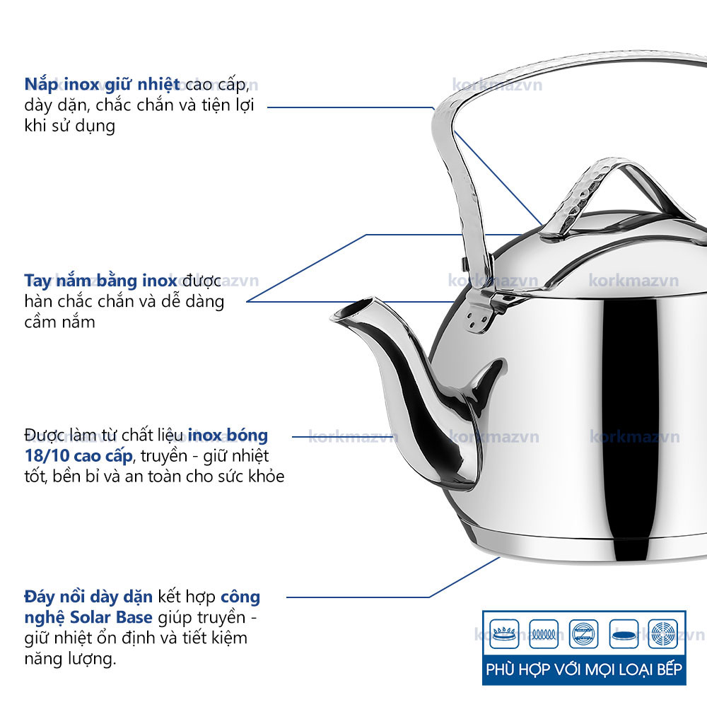 Mô tả sản phẩm - Ấm inox là một trong những dòng sản phẩm cao cấp của thương hiệu Korkmaz. - Được chế tác từ thép không gỉ cao cấp 18/10 (thành phần có Cr-Ni)