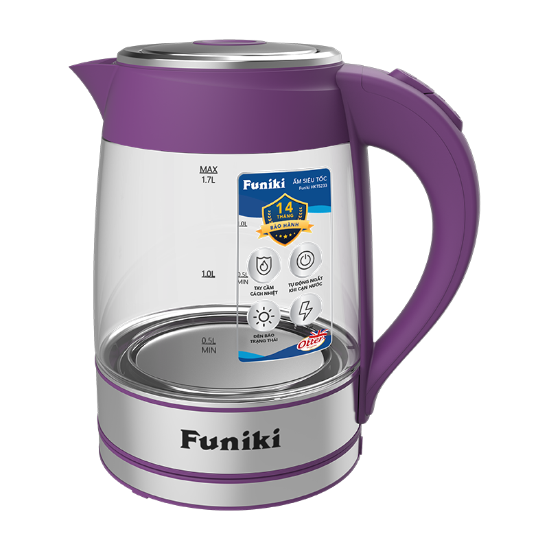 - Thân ấm trong suốt bằng thủy tinh Boroslilicate cao cấp bền và chống bám bẩn THÔNG SỐ KỸ THUẬT: ️ Thương hiệu: Funiki ️ Điện áp: 220-240V/50Hz ️ Công suất: 1850 - 2200W ️ Dung tích: 1.8 lít ️ Bộ điều khiển: Otter của Anh ️ Nút mở: Nút bấm tại tay cầm ️ Công tắc nguồn: Nút bấm ️ Đèn led: Có ️ Mâm nhiệt: Thép không gỉ 304 S ️ Chất liệu thân vỏ: Thủy tinh một lớp Borosilicate cao cấp (dày 1,5 - 1,8 mm) và thép ️ Chất liệu tay cầm và đế: Nhựa PP ️ Kích thước: 231,1 x 160 x 243,5 mm ️ Khối lượng: 1,33 kg ️ Màu sắc: Tím ️ Bảo hành: 14 tháng ️ Xuất xứ: Trung Quốc