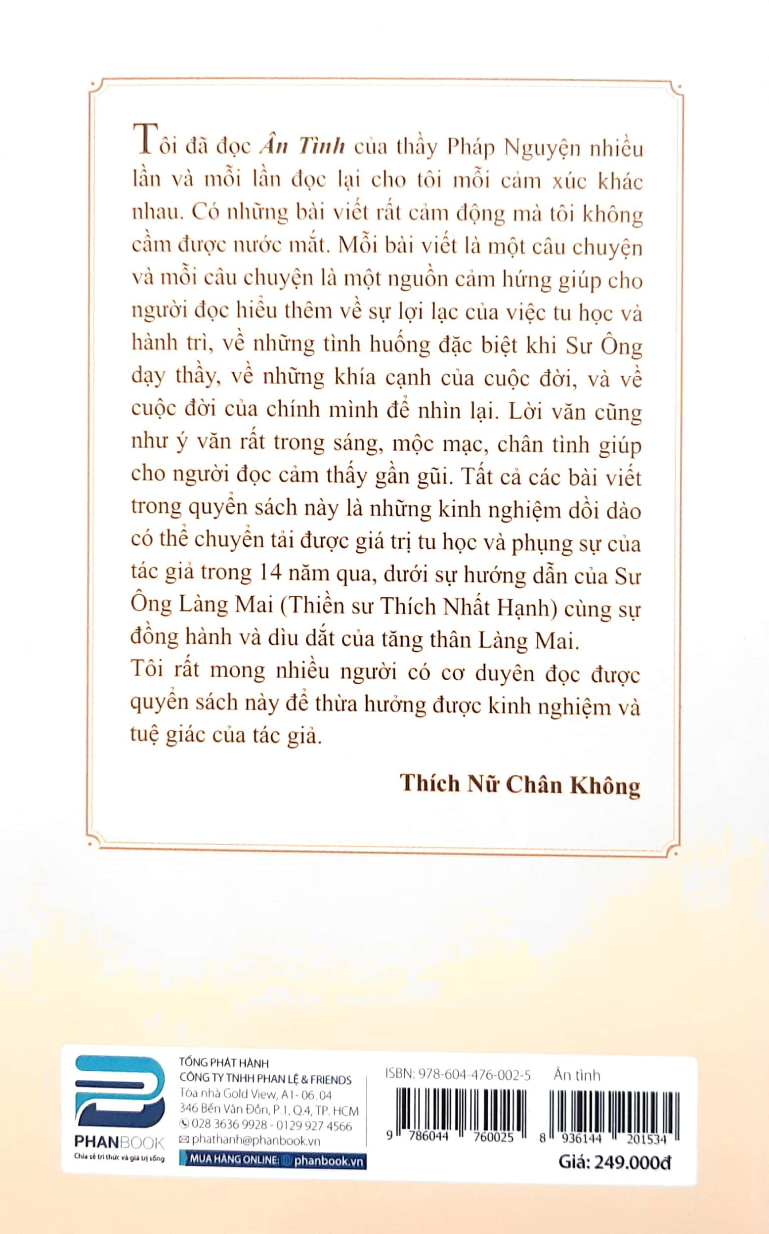 Tôi đã đọc Ân Tình của thầy Pháp Nguyện nhiều lần và mỗi lần đọc lại cho tôi mỗi cảm xúc khác nhau. Có những bài viết rất cảm động mà tôi không cầm được nước mắt. Mỗi bài viết là một câu chuyện và mỗi câu chuyện là một nguồn cảm hứng giúp cho người đọc hiểu thêm về sự lợi lạc của việc tu học và hành trì, về những tình huống đặc biệt khi Sư Ông dạy thầy, về những khía cạnh của cuộc đời, và về cuộc đời của chính mình để nhìn lại. Lời văn cũng như ý văn rất trong sáng, mộc mạc, chân tình giúp cho người đọc cảm thấy gần gũi. Tất cả các bài viết trong quyển sách này là những kinh nghiệm dồi dào có thể chuyển tải được giá trị tu học và phụng sự của tác giả trong 14 năm qua, dưới sự hướng dẫn của Sư Ông Làng Mai (Thiền sư Thích Nhất Hạnh) cùng sự đồng hành và dìu dắt của tăng thân Làng Mai.