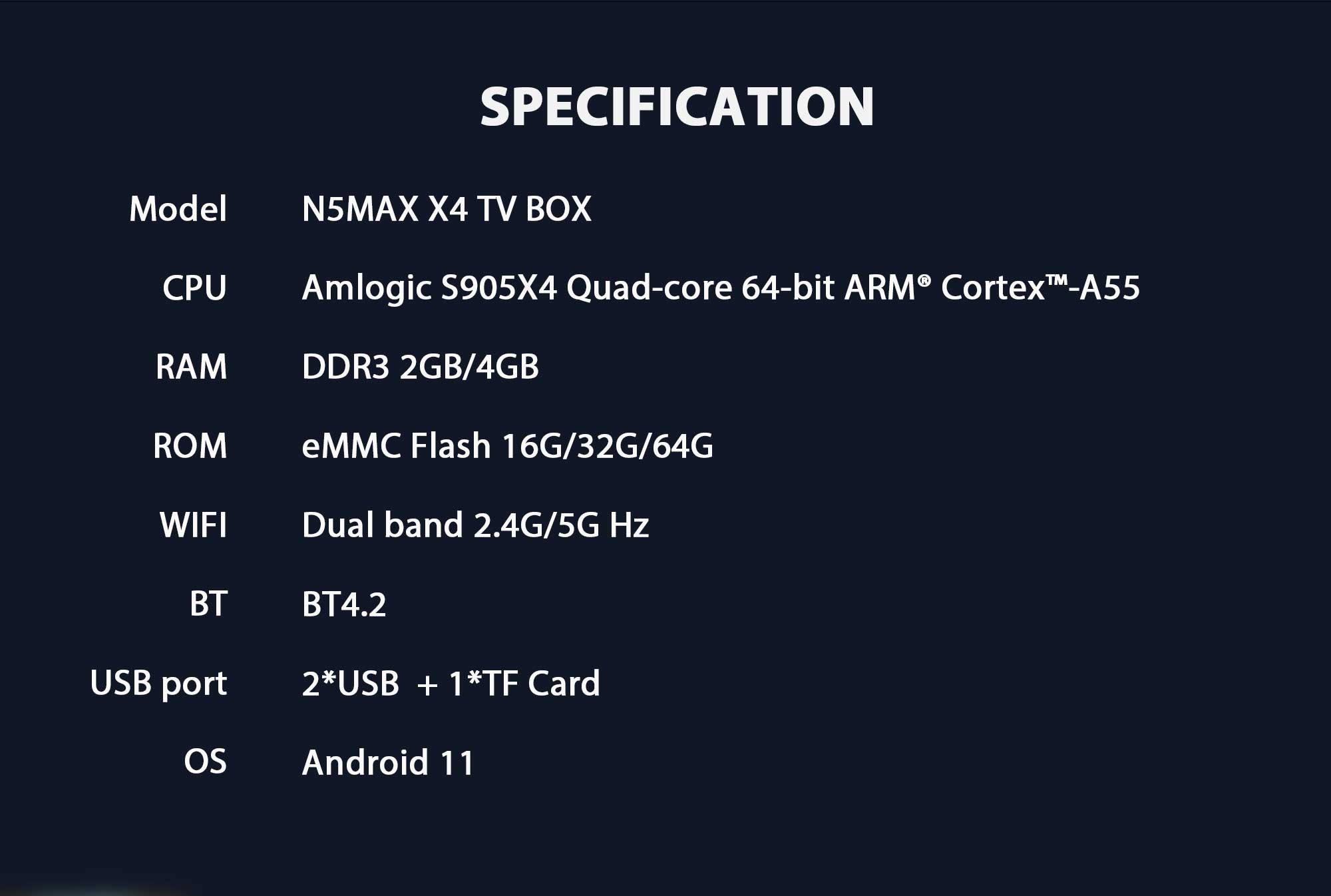• Chỉ cần nói tên bài hát hoặc nội dung cần tìm sẽ ra kết quả từ Google     Amlogic S905X4 Amlogic S905X4 áp dụng bộ xử lý lõi tứ Cortex-A55, nó là "bộ xử lý ứng dụng tiên tiến được thiết kế cho các n5 max x4 OTT / IP Set-Top Box (STB) cao cấp. Các lõi Cortex-A55 cung cấp tới hai lần hiệu suất so với Cortex-A53 về điểm chuẩn bộ nhớ và cải thiện hiệu suất 20 đến 30% điển hình hơn cho các tác vụ thông thường ở cùng tần số. Hệ điều hành Android 11 Nó dựa trên hệ điều hành Android 11 mới nhất, với tốc độ cao và hiệu năng mượt mà, được thiết kế để biến TV thông thường của bạn thành một tivi thông minh. Độ phân giải 8K UHD Độ phân giải hình ảnh thật 8k có thể lên tới 7680 4320 để đạt được độ chính xác gấp 16 lần hình ảnh 1080p. USB 3.0 Tốc độ đọc / ghi cao. USB 3.0 có tốc độ tối đa 5 gigabit mỗi giây, về mặt lý thuyết nhanh hơn mười lần so với USB 2.0. WiFi băng tần kép 2.4G / 5G Với sự hỗ trợ cho băng tần 2.4Ghz và 5Ghz, nó có thể truyền lượng dữ liệu cao hơn. Thiết bị xem phim Full HD cõ hỗ trợ xem phim 4K cho các dòng TV cao cấp n5 max x4 được thiết kế không khác gì một chiếc điện thoại cao cấp ngoại trừ tính năng nge và gọi. Các bạn có thể vào mạng, lướt web, xem phim, xem bóng đá, đọc tin tức. Thiết bị n5 max x4 sẽ thay thế và bổ trợ cho các dòng TV đã là Smart Tv hoặc chỉ là TV thông thường. Đặc biết các bạn có thể thoải mái truy cập vào kho ứng dụng CH PAY của Google tải bất kỳ ứng dụng nào muốn vè TV nhà bạn. Google tải bất kỳ ứng dụng nào muốn vè TV nhà bạn.   TẤT CẢ ĐÃ CÓ TRONG THIẾT BỊ ANDROID TV  Về mặt trước nổi bật trên mặt sản phẩm là Logo Magicsee N5 max X4 được in nổi chính là điểm ấn tượng đầu tiên Sản phẩm có thiết kế nhỏ gọn với chiều ngang 10.5, chiều dài 10.5, chiều cao 2.8cm . android tivi box cũng chạy trên Android 11 Như đã thấy, ở mặt sau vẫn là cách bố trí các cổng kết nối quen thuộc, bao gồm 2 cổng USB ,1 khe thẻ, 1x AV, 1 cổng HDMI, cổng mạng JR45 và một cổng nguồn DC 5V-2A,  cổng âm thanh số n5 max x4 hiện đang là sản phẩm được ưu chuộng trên thị trường không những bởi hiệu suất tuyệt vời của nó mà con do thiết kế . Với thiết kế mang phong cách cách của 1 siêu phẩm sản phẩm chỉ nhỏ gọn bằng 1 chiếc smart phone mang đến sự hiện đại và sang trang cho ngôi nhà bạn.       CPU : Amlogic S905X4 64-bit Quad Core ARM Cortex A55 CPU GPU : G31 MP2 Bộ xử lý GPU Bộ nhớ LPDDR4: 4GB Rom: 32GB Wifi :IEEE 802.11 A/B/g/n/AC; 2.4G / 5G Hệ điều hành : Android 11 Bluetooth  1 HDMI,HD 2.1, Hỗ Trợ HD CEC, HDR và và 8K x 4K @ 24 Độ phân giải đầu ra  1 AV OUT 480i/576i tiêu chuẩn đầu ra độ nét  3 USB 1 USB 3.0 ; 2 USB 2.0  1 Giao Diện Ethernet; Hỗ Trợ 10/100M 1 TF Hỗ trợ 4GB / 16GB / 32GB / 64GB TV abbreviation TV, tivi