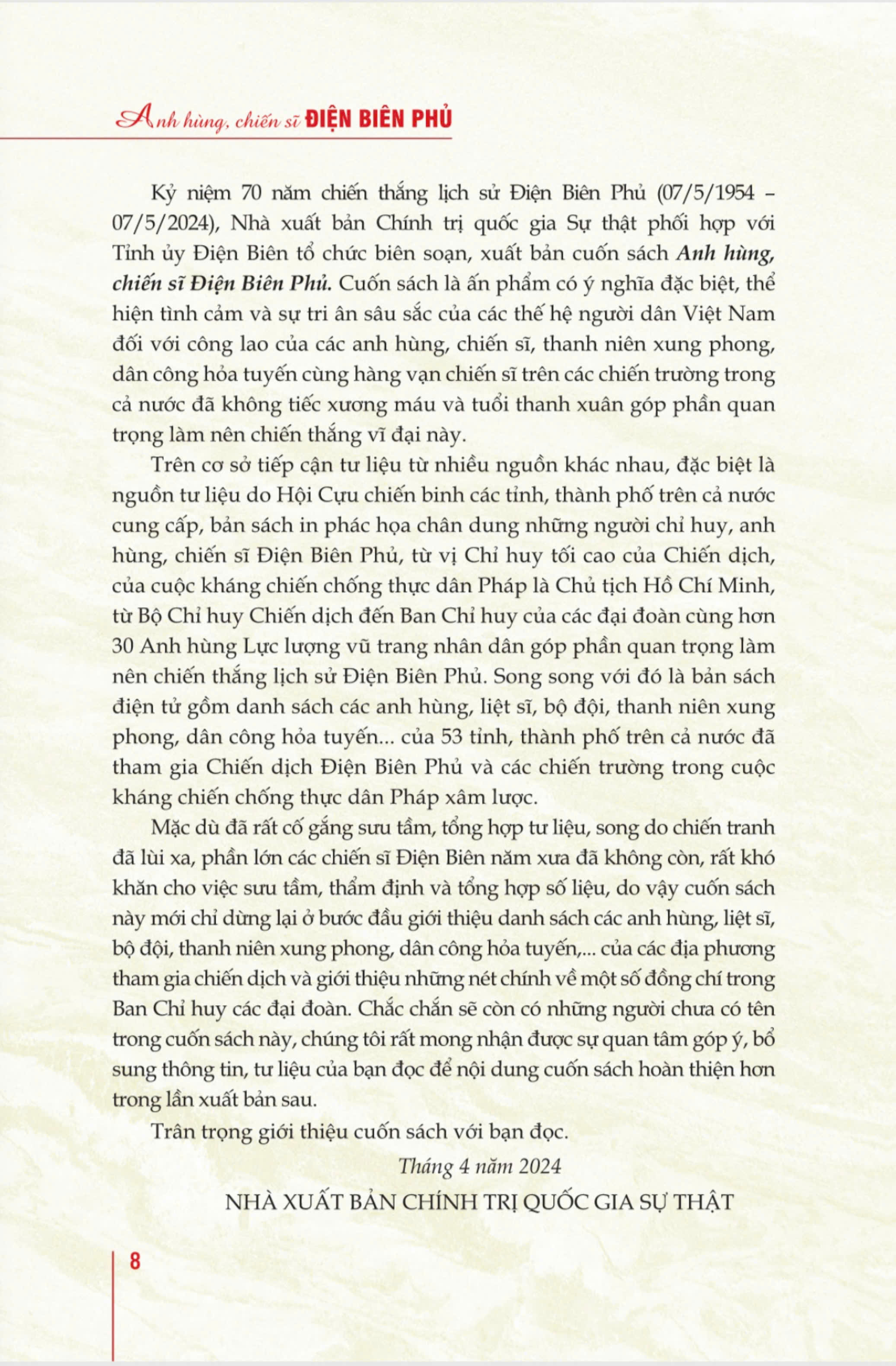 Kỷ niệm 70 năm chiến thắng lịch sử Điện Biên Phủ (07/5/1954 - 07/5/2024), Nhà xuất bản Chính trị quốc gia Sự thật phối hợp với Tỉnh ủy Điện Biên tổ chức biên soạn, xuất bản cuốn sách Anh hùng, chiến sĩ Điện Biên Phủ. Cuốn sách là ấn phẩm có ý nghĩa đặc biệt quan trọng, thể hiện tình cảm và sự tri ân sâu sắc của các thế hệ người dân Việt Nam đối với công lao của các anh hùng, liệt sĩ đã anh dũng hy sinh xương máu và tuổi thanh xuân cho chiến thắng vĩ đại này.