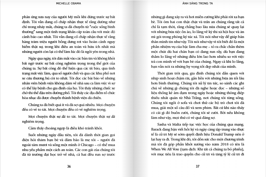 Trong khi cuốn sách đầu tiên dẫn dắt độc giả bước vào thế giới riêng của Michelle Obama - từ tuổi thơ ở Chicago đến 8 năm quyền lực sống tại Nhà Trắng, “Ánh sáng trong ta” khai thác chặng đường khó khăn của bà trong giai đoạn dịch bệnh COVID-19 hoành hành. Cuốn sách không chỉ cung cấp những góc nhìn đầy chiến lược về thời cuộc, mà còn mở ra chiếc “hộp công cụ” hữu ích giúp độc giả giữ vững lòng tin và nuôi dưỡng hy vọng trong tâm hồn.