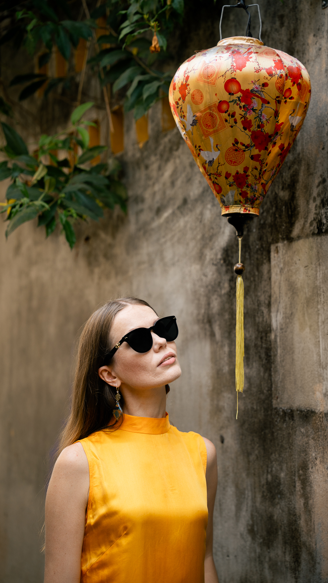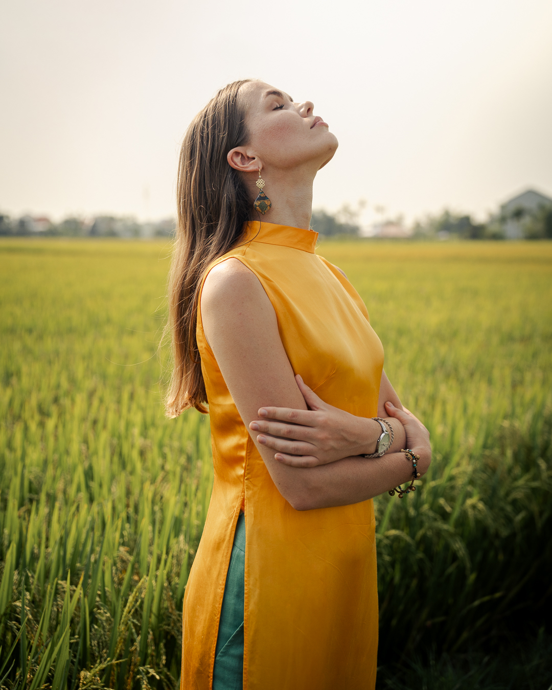 Tấm áo dài cách tân mang sắc màu óng ả nắng vàng lấy cảm hứng từ sắc hoa mùa thu nhiệt đới dã quỳ – loài hoa nổi bật với sắc vàng rực rỡ, phủ kín các sườn đồi cao nguyên. Với tinh thần luôn hướng về cảm xúc giao thoa giữa truyền thống và hiện đại, tấm áo dài Dã Quỳ được Hity thiết kế theo phong cách tối giản, không quá cầu kỳ nhưng vẫn giữ được vẻ đẹp tinh tế, tôn lên sự duyên dáng của người phụ nữ. Màu vàng nổi bật từ hoa dã quỳ tạo nên vẻ đẹp tự nhiên, tươi mới, mang đậm dấu ấn của mùa thu vùng nhiệt đới. Những chi tiết nhỏ như đường viền cổ áo, những đường cắt may khéo léo tạo nên nét chấm phá riêng, vừa giữ được vẻ cổ điển của áo dài truyền thống vừa thêm nét trẻ trung hiện đại. Chất liệu lụa tơ tằm được dệt từ làng lụa đũi Nam Cao, Thái Bình mềm mại, nhẹ nhàng và mát mẻ, giúp người mặc cảm nhận từng hơi thở đất trời thật nhẹ nhàng thanh cao. Áo dài kiểu dáng suông cách tân không tay Cổ cao 3.5cm Chích ben ngực và ben lưng Cài bằng dây khoá kéo sau lưng CHẤT LIỆU Lụa tơ tằm 100%, sợi tơ tằm tự nhiên Việt Nam Sản phẩm vải của HTX Làng nghề Lụa đũi Nam Cao Thái Bình với 100% từ tơ tằm tự nhiên đạt những tiêu chuẩn cao Dệt máy Khổ vải: 90cm Nghệ nhân: Ninh Trung Cắt may thủ công tinh tế tại Hity Atelier Nha Trang, Việt Nam Hướng dẫn sử dụng: Tránh ánh nắng mặt trời: Không phơi lụa tơ tằm dưới ánh nắng trực tiếp vì có thể làm vải bị phai màu và giảm độ bền của sợi. Giữ khô ráo: Không để lụa tiếp xúc lâu với nước hay các chất lỏng có thể gây ra các vết bẩn khó giặt. Không dùng nước hoa hay xịt khử mùi trực tiếp: Các chất hóa học trong nước hoa hay xịt khử mùi có thể làm hỏng sợi lụa và tạo vết ố. Cách giặt: Giặt bằng tay hoặc giặt hấp. Đổ đầy nước lạnh 24 - 35 độ C vào chậu hoặc bồn rửa. Thêm 5ml dầu gội hoặc xà bông dịu nhẹ, không chất tẩy vào chậu hoặc bồn rửa, khuấy đều cho nước lên bọt. Nhúng ngập đồ lụa vào bồn rửa, khuấy nhẹ để đồ lụa ngấm nước từ từ. bạn có thể ngâm đồ lụa từ 3-4 phút, sau đó vò nhẹ bằng tay. Xả 3 đến 4 lần nước lạnh làm sạch, sau đó nhấc đồ tơ tằm ra và giũ nước. Không vắt sẽ làm đồ lụa bị nhăn. Không vò hay vắt mạnh: Khi giặt, nhẹ nhàng bóp nhẹ để làm sạch và xả lại bằng nước sạch. Không vò hay vắt mạnh vì có thể làm hỏng cấu trúc của sợi. Không sử dụng nước tẩy / thuốc tẩy Sử dụng dấm hoặc chanh: Khi xả, có thể thêm một chút dấm hoặc nước chanh vào nước xả cuối để giữ cho lụa mềm mại và sáng bóng. Chỉ giặt riêng từng sản phẩm để tránh các sản phẩm loang màu sang nhau. Cách làm khô Phơi khô trên bề mặt phẳng, nơi thoáng gió, dưới bóng râm, tránh phơi trực tiêp dưới ánh nắng sẽ làm lụa khô, yếu sợi và phai màu. Không sử dụng máy sấy có thể làm co và làm hỏng cấu trúc của lụa. Cách ủi (là) Ủi ở nhiệt độ tối đa 110ºC (Chế độ Lụa Silk) Ủi bằng bàn ủi hơi nước Ủi mặt trái: Đặt một lớp vải mỏng lên trên lụa và là từ mặt trái để tránh làm bóng vải Lụa nên khô hoàn toàn trước khi ủi để tránh hiện tượng co rút. Bảo quản