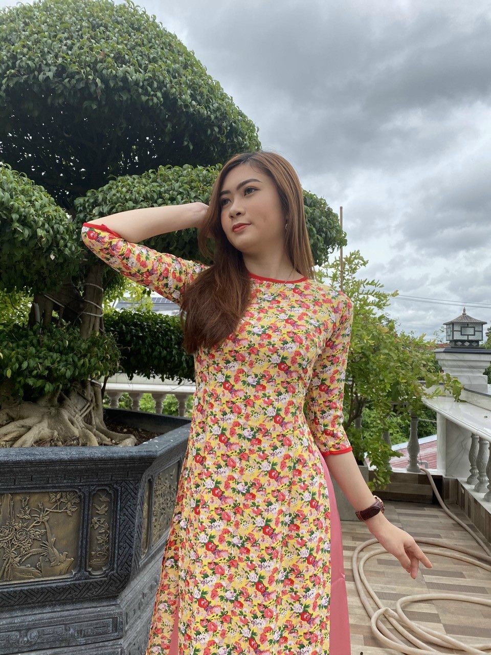 Thiết kế Áo dài nữ hồng vàng họa tiết hoa hồng cao cấp phong cách đường may tỉ mỉ. Áo thiết kế form vừa vặn giúp tôn được đường nét phong cách của các tính