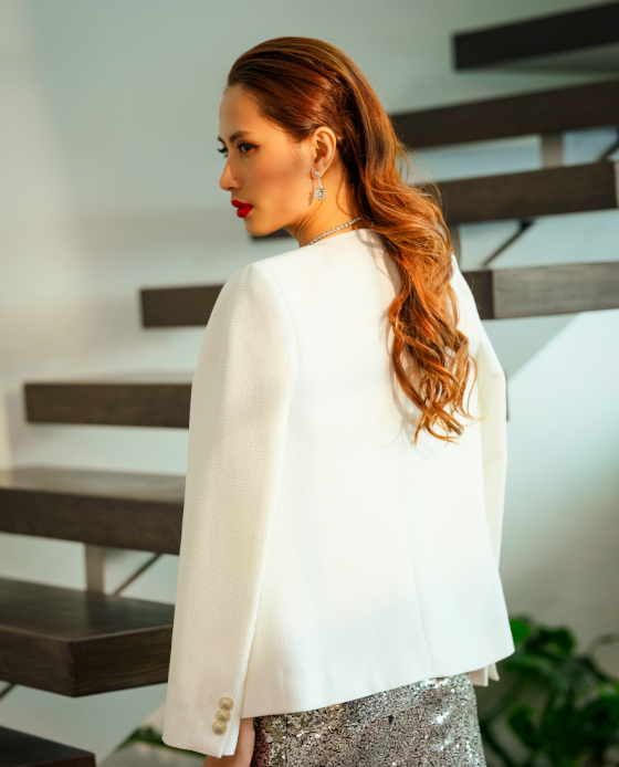 Áo Jacket Tweed Hà Giang TOP187 thời trang thiết kế Hity Sang trọng. Quý phái. Quyền lực mềm. Đó chính là cảm nhận của người chung quanh khi ngắm nhìn ngưỡng mộ vẻ đẹp của bạn trong chiếc áo khoác trắng Hà Giang từ Hity. Kiểu dáng áo khoác jacket với cổ tròn, tay dài, hai túi trên ngực và nắp túi giả phần dưới thân mang đến cho người mặc vẻ đẹp trẻ trung, hiện đại và vô cùng sang trọng. Điểm nhấn là những chiếc nút mạ vàng từ nguyên liệu tái chế càng tôn lên vẻ sang trọng và tinh tế của người mặc. Màu trắng tinh khôi tượng trưng cho sự thuần khiết, tinh tế và thanh lịch. Chất liệu tweed trắng như thay bạn đưa ra tuyên ngôn về phong cách cá nhân: uyển chuyển, thuần khiết như nội lực mạnh mẽ. Áo khoác tweed trắng có thể kết hợp với nhiều trang phục khác nhau, từ quần âu, váy liền thân đến chân váy bút chì. Dưới đây là một số gợi ý cách phối đồ với áo khoác tweed trắng cho nữ doanh nhân: