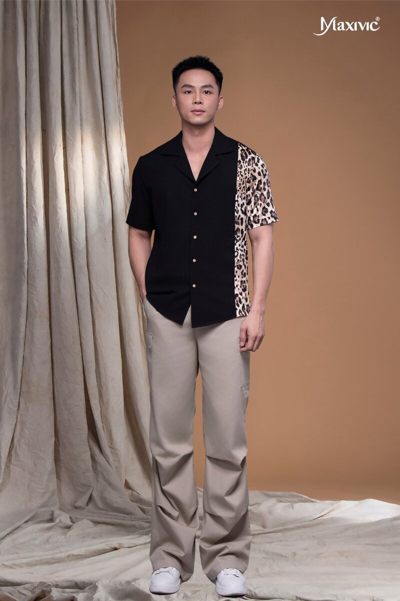 - Áo sơmi đen tay ngắn, cổ tim phối hoạ tiết da beo bên phần cánh tay và thân áo, mang lại vẻ ngoài phóng khoáng và trẻ trung cho người mặc