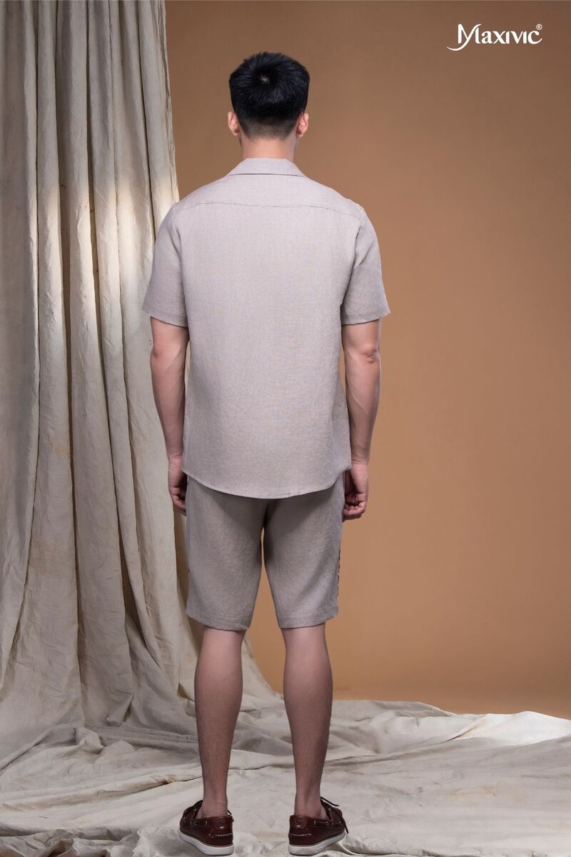 - Áo sơmi linen màu xám phối sọc da beo mang lại vẻ ngoài phóng khoáng và sang trọng cho người mặc