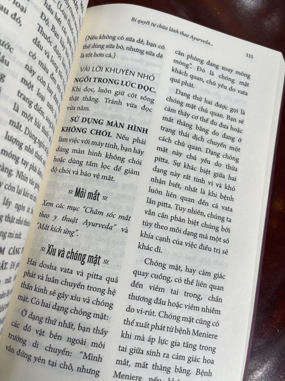 Là môn khoa học về sự tự chữa lành, Ayurveda bao gồm chế độ ăn và dinh dưỡng, lối sống, việc luyện tập, nghỉ ngơi và thư giãn, thiền định, các bài tập thở, các loại thảo mộc, cùng những chương trình thanh lọc và trẻ hóa để chữa lành cơ thể, tâm trí và tinh thần. Ngoài ra, một số liệu pháp bổ trợ như âm thanh, màu sắc và mùi hương cũng có thể được đưa vào sử dụng. Cuốn sách này nhằm giúp bạn làm quen với những biện pháp tự nhiên kể trên, để từ đó bạn có thể lựa chọn lối sống cho riêng mình và nắm bắt những phương thức tự chữa lành phù hợp nhằm đạt đến mục đích cuối cùng là tạo dựng, duy trì hoặc khôi phục sức khỏe và sự cân bằng.