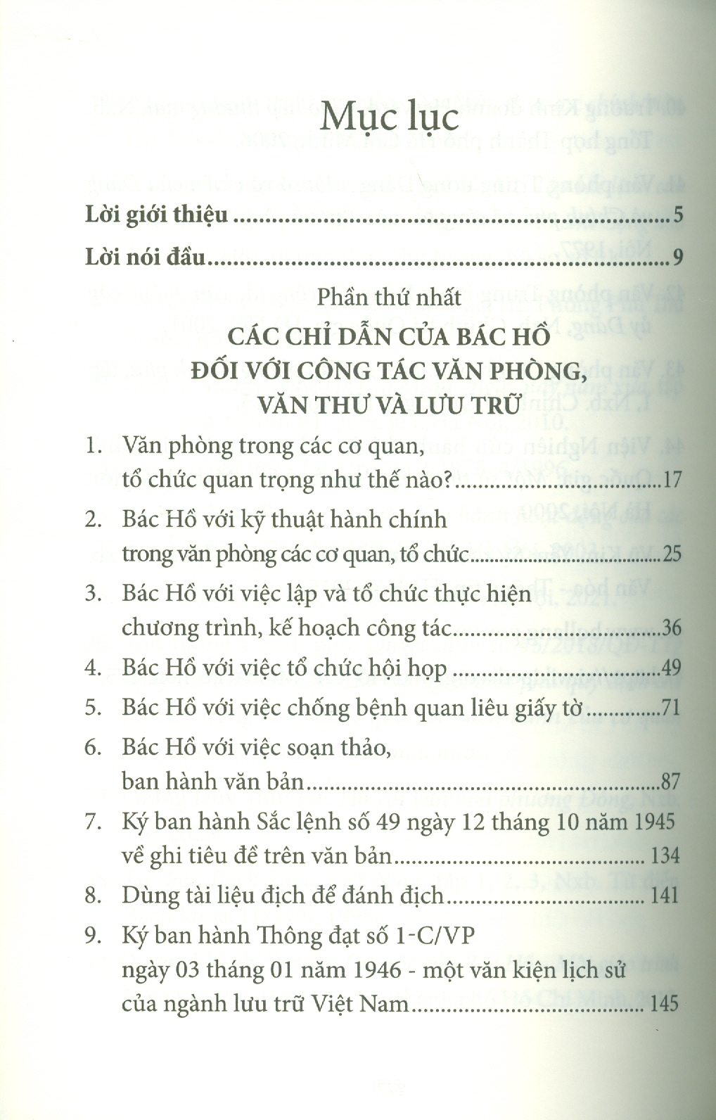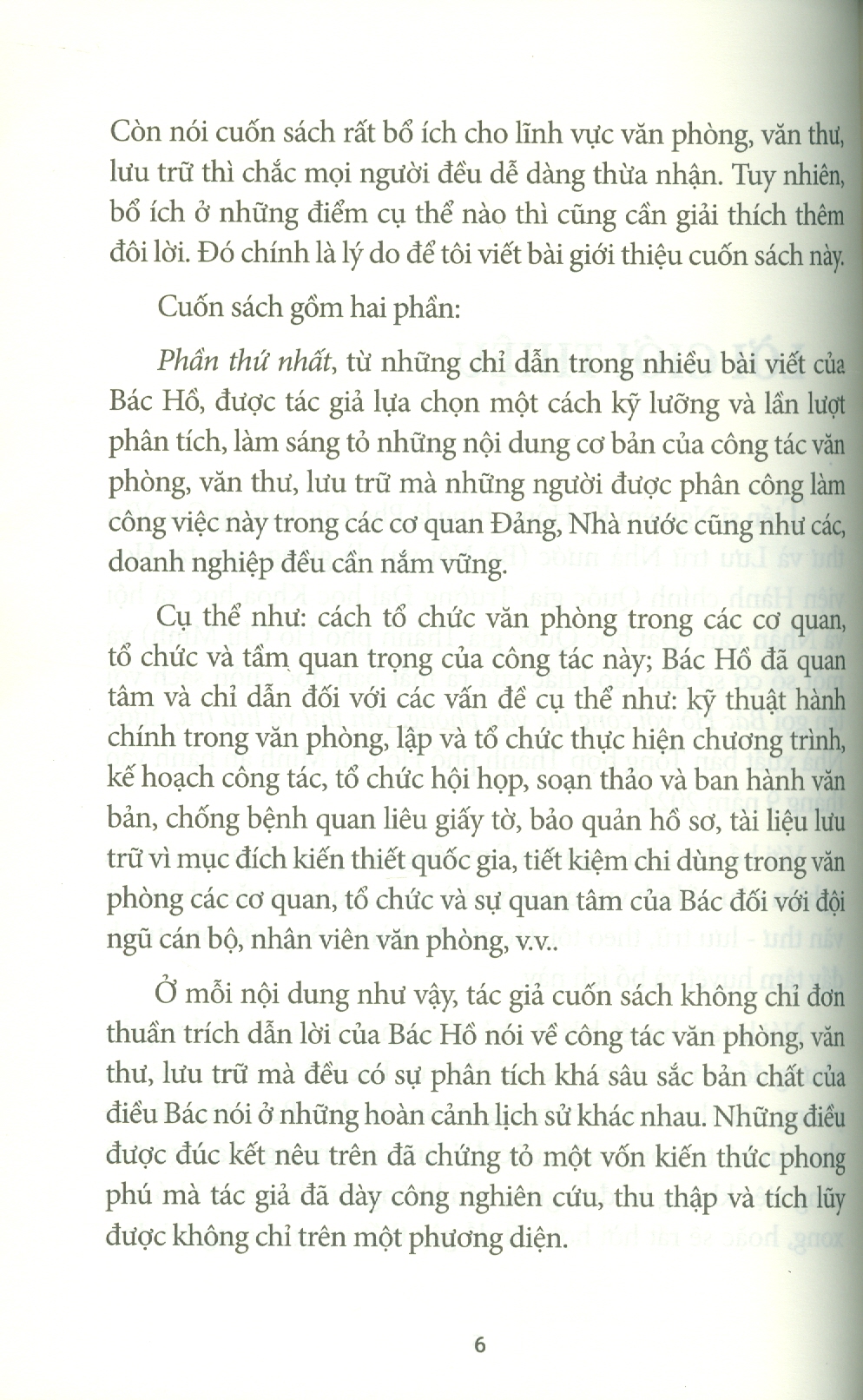 Phần thứ nhất, từ những chỉ dẫn trong nhiều bài viết của Bác Hồ, được tác giả lựa chọn một cách kỹ lưỡng và lần lượt phân tích, làm sáng tỏ những nội dung cơ bản của công tác văn phòng, văn thư, lưu trữ mà những người được phân công làm công việc này trong các cơ quan Đảng, Nhà nước cũng như các doanh nghiệp đều cần nắm vững.