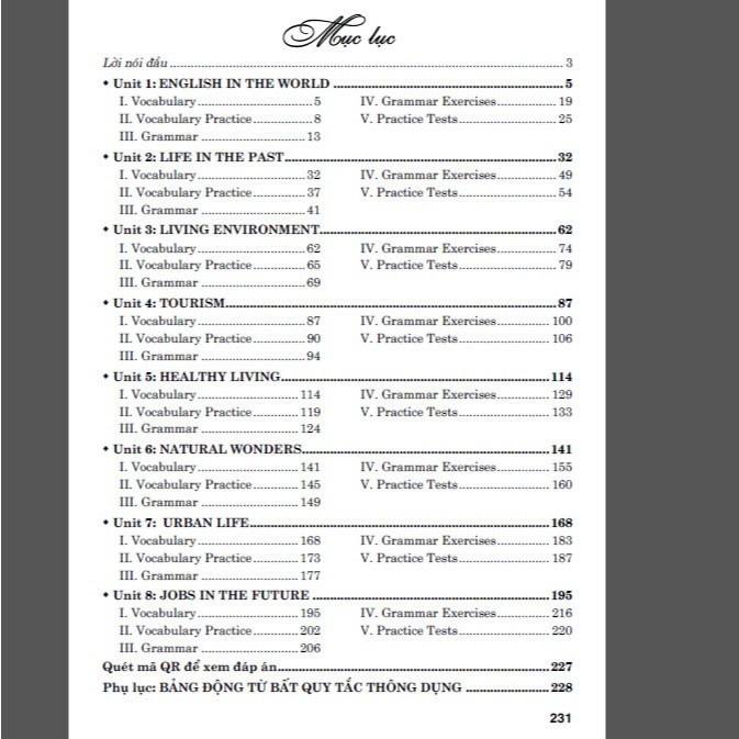 V. Practice Tests: Cuối mỗi Unit, chúng tôi biên soạn hai Practice Tests gồm nhiều dạng câu hỏi khác nhau với cả hai hình thức trắc nghiệm và tự luận. Mục đích các bài Practice Tests này nhằm giúp học sinh củng cố và nâng cao kiến thức từ vựng và ngữ pháp đã học trong mỗi Unit.