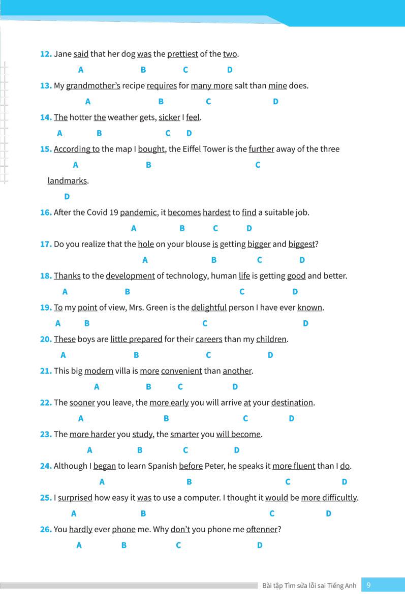 Với bài tập Tìm sửa lỗi sai trong kì thi vào 10 và 10 chuyên môn Tiếng Anh, cuốn sách phân chia làm 13 dạng thường gặp nhất: Thì của động từ, so sánh, mệnh đề quan hệ, câu gián tiếp, câu điều kiện, câu đảo ngữ,