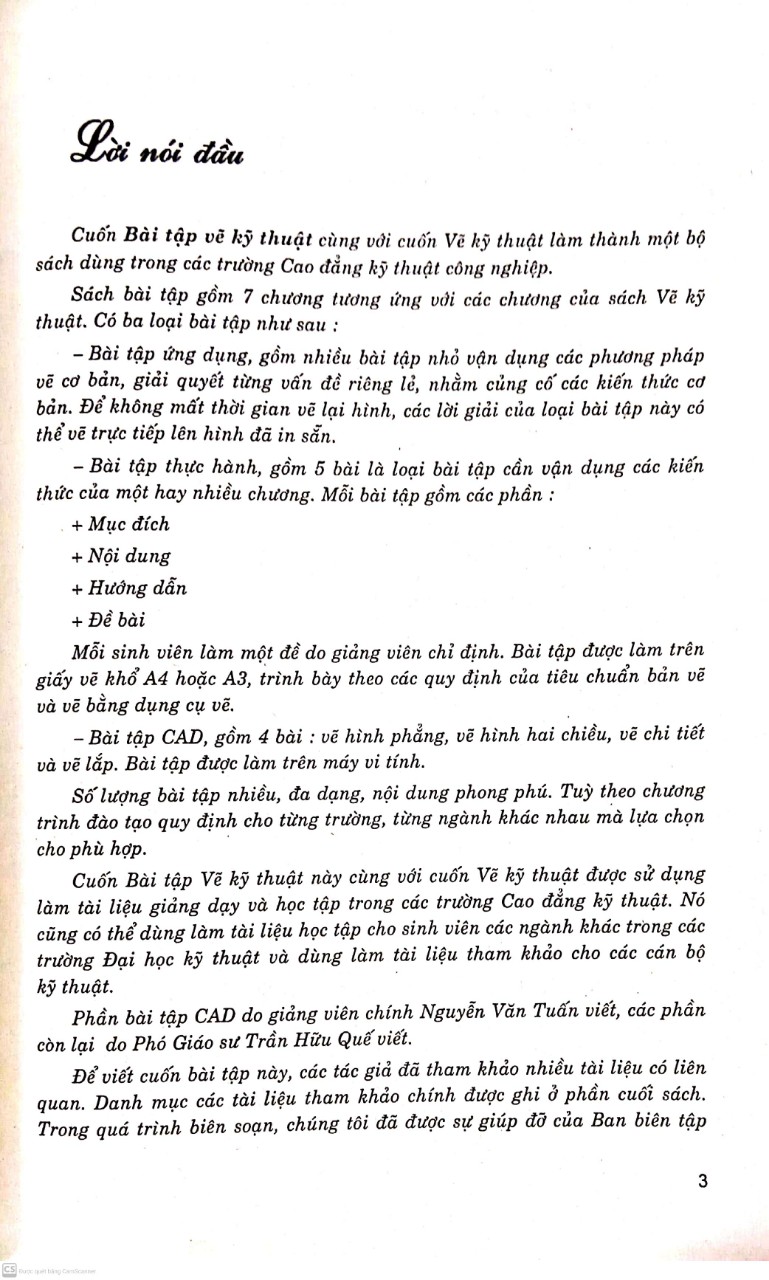 Cuốn Bài tập vẽ kỹ thuật cùng với cuốn Vẽ kỹ thuật làm thành một bộ sách dùng trong các trường Cao đẳng kỹ thuật công nghiệp. Sách bài tập gồm 7 chương tương ứng với các chương của sách Vẽ kỹ thuật. Có ba loại bài tập như sau: – Bài tập ứng dụng, gồm nhiều bài tập nhỏ vận dụng các phương pháp vẽ cơ bản, giải quyết từng vấn đề riêng lẻ, nhằm củng cố các kiến thức cơ bản. Để không mất thời gian vẽ lại hình, các lời giải của loại bài tập này có thể vẽ trực tiếp lên hình đã in sẵn. – Bài tập thực hành, gồm 5 bài là loại bài tập cần vận dụng các kiến thức của một hay nhiều chương. Mỗi bài tập gồm các phần : + Mục đích + Nội dung + Hướng dẫn + Đề bài Mỗi sinh viên làm một đề do giảng viên chỉ định. Bài tập được làm trên giấy vẽ khổ A4 hoặc A3, trình bày theo các quy định của tiêu chuẩn bản vẽ và vẽ bằng dụng cụ vẽ. – Bài tập CAD, gồm 4 bài : vẽ hình phẳng, vẽ hình hai chiều, vẽ chi tiết và vẽ lắp. Bài tập được làm trên máy vi tính. Số lượng bài tập nhiều, đa dạng, nội dung phong phú. Tuỳ theo chương trình đào tạo quy định cho từng trường, từng ngành khác nhau mà lựa chọn cho phù hợp. Cuốn Bài tập Vẽ kỹ thuật này cùng với cuốn Vẽ kỹ thuật được sử dụng làm tài liệu giảng dạy và học tập trong các trường Cao đẳng kỹ thuật. Nó cũng có thể dùng làm tài liệu học tập cho sinh viên các ngành khác trong các trường Đại học kỹ thuật và dùng làm tài liệu tham khảo cho các cán bộ kỹ thuật. Phần bài tập CAD do giảng viên chính Nguyễn Văn Tuấn viết, các phần còn lại do Phó Giáo sư Trần Hữu Quế viết. Để viết cuốn bài tập này, các tác giả đã tham khảo nhiều tài liệu có liên quan. Danh mục các tài liệu tham khảo chính được ghi ở phần cuối sách. Trong quá trình biên soạn, chúng tôi đã được sự giúp đỡ của Ban biên tập
