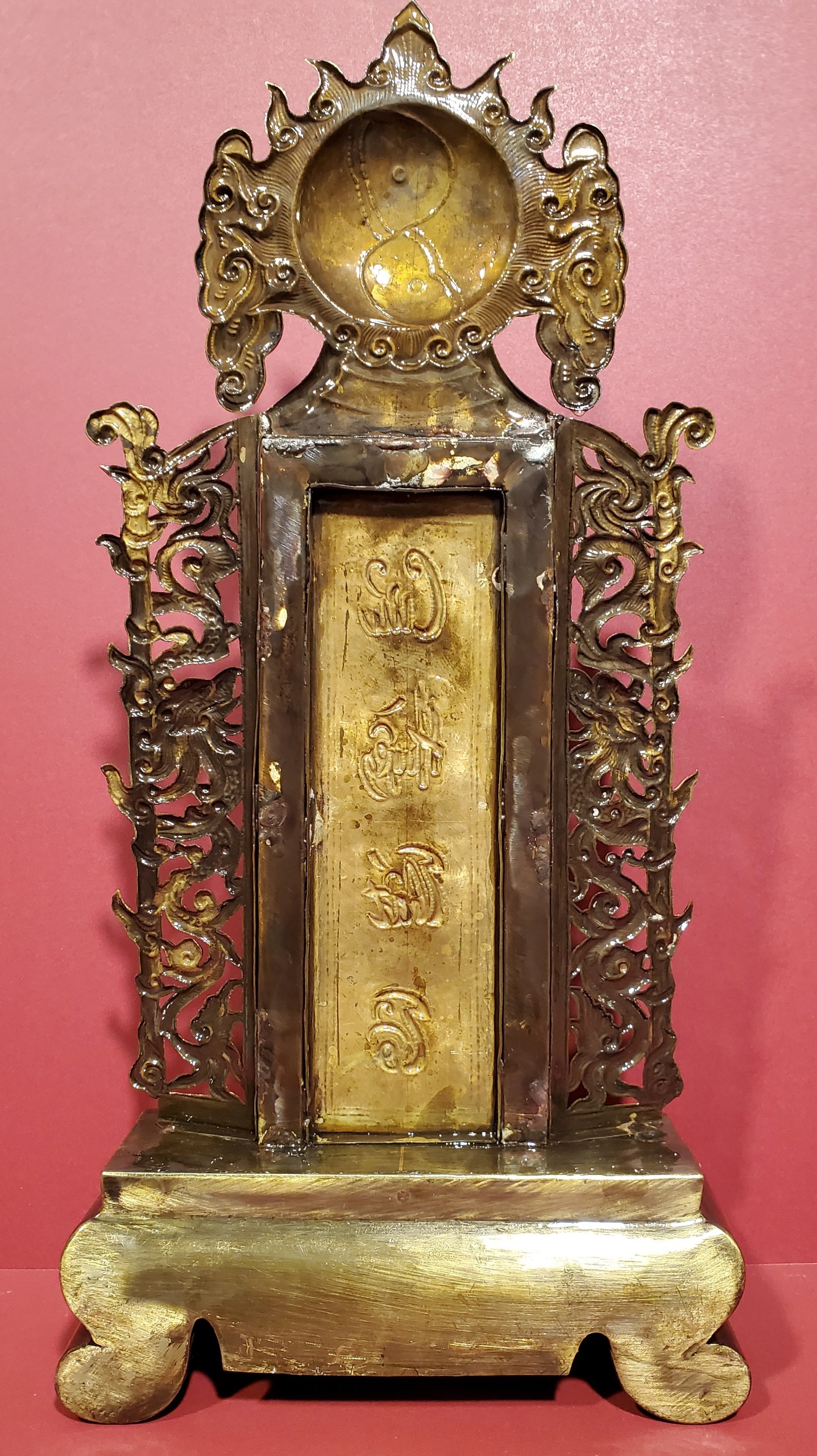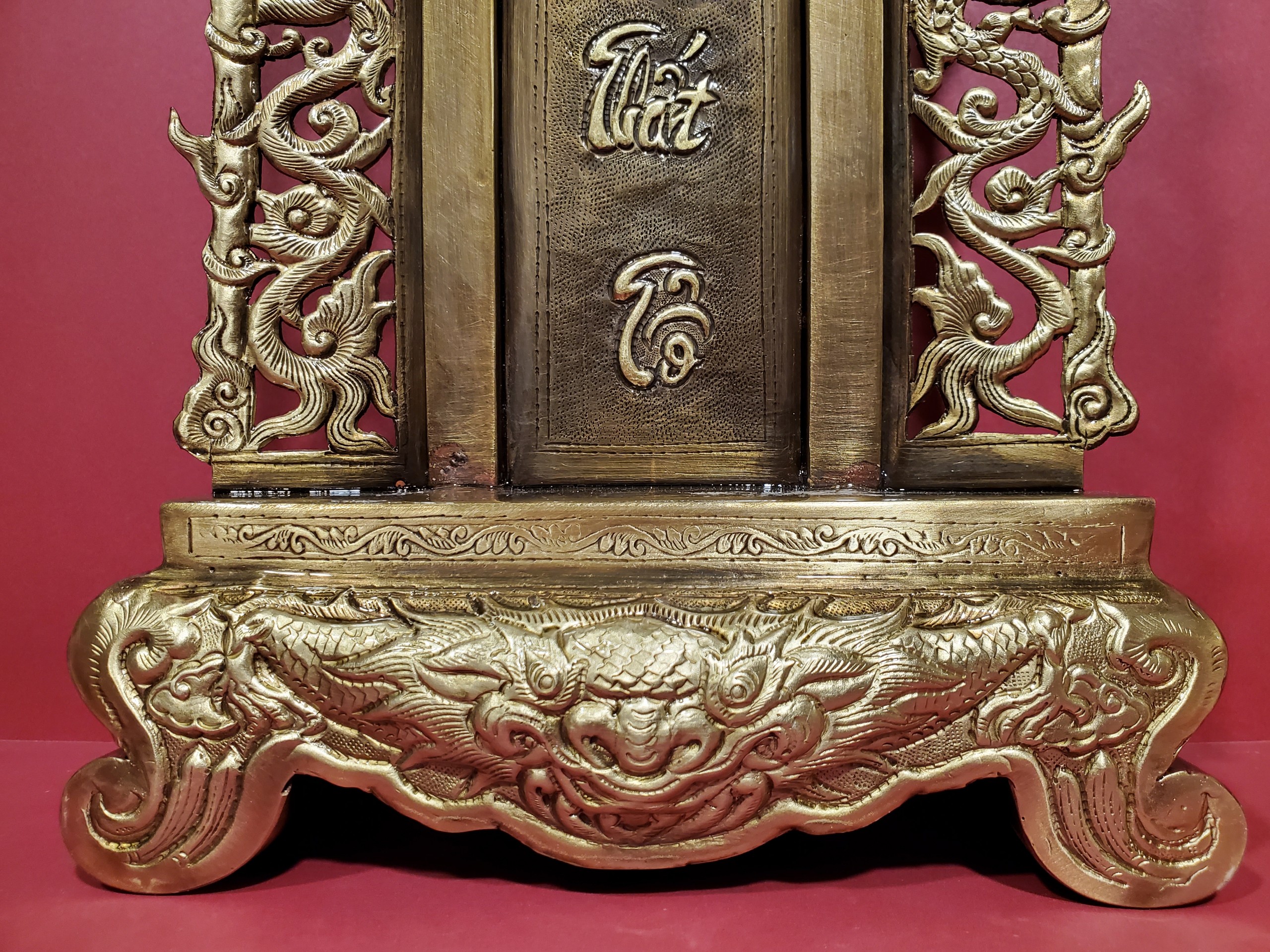 Bài vị thờ - Cửu huyền thất tổ Chất liệu: Đồng vàng nguyên chất 100% được chế tác thúc gò, chạm khảm hoa văn sắc nét, hun màu giả cổ. Kích thước Cao 43cm x