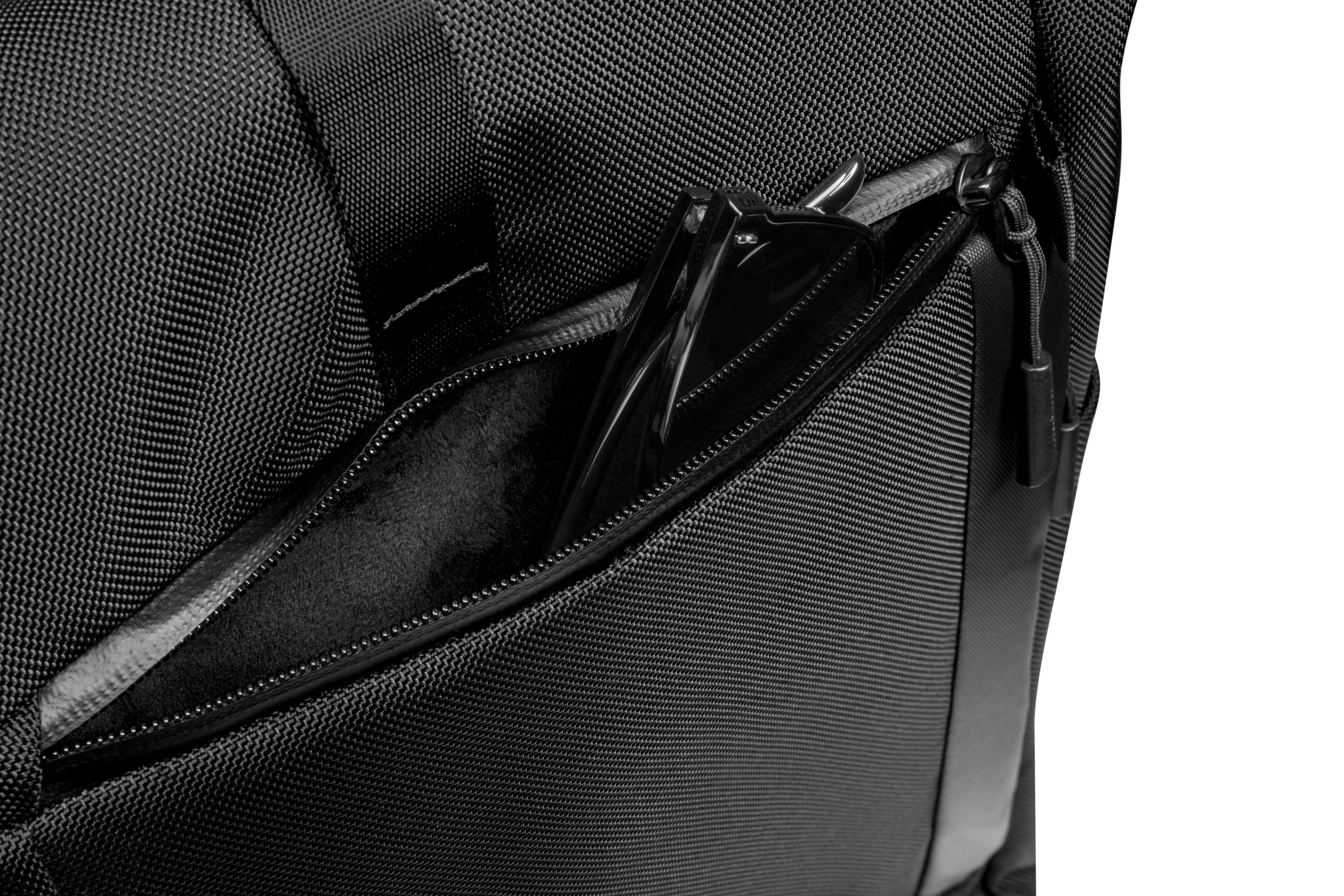 Balo có ngăn chính rộng lớn (với kẹp chai nước và hai túi bên trong) và một ngăn riêng biệt được đệm cho các thiết bị công nghệ, đủ chỗ cho quần áo, sách vở, đồ cần thiết hàng ngày, dành cho MacBook 16″, máy tính bảng và phụ kiện. Một ngăn phía trước dọc với lớp lót mềm mịn cao mật độ để đựng kính hoặc phụ kiện dễ vỡ. Một ngăn bên có thêm một móc khóa để tiện lợi truy cập chìa khóa.