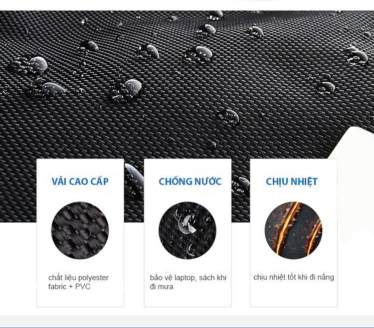 Kích thước : rộng 30cm ,cao 42.5cm,dày 12cm Phương pháp sản xuất: công nghệ cao Chất liệu : Màng chống thấm nylon được mã hóa SIÊU CHỐNG THẤM NƯỚC Chức năng: Không thấm nước, thoáng