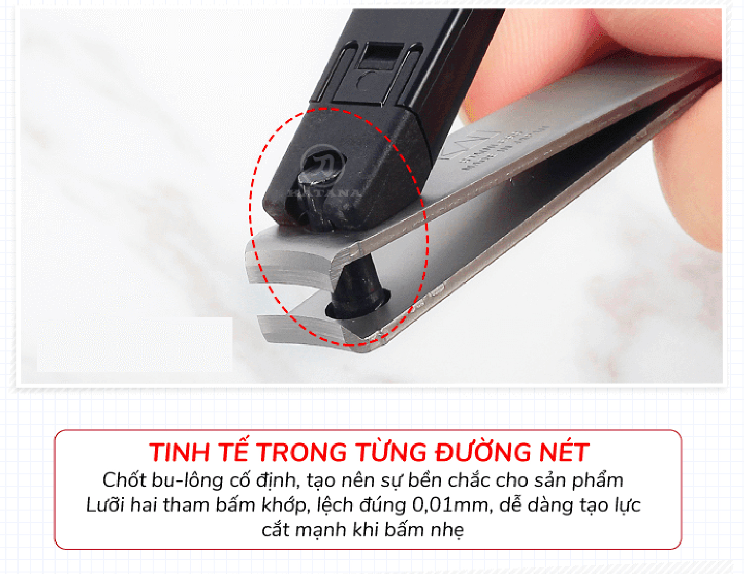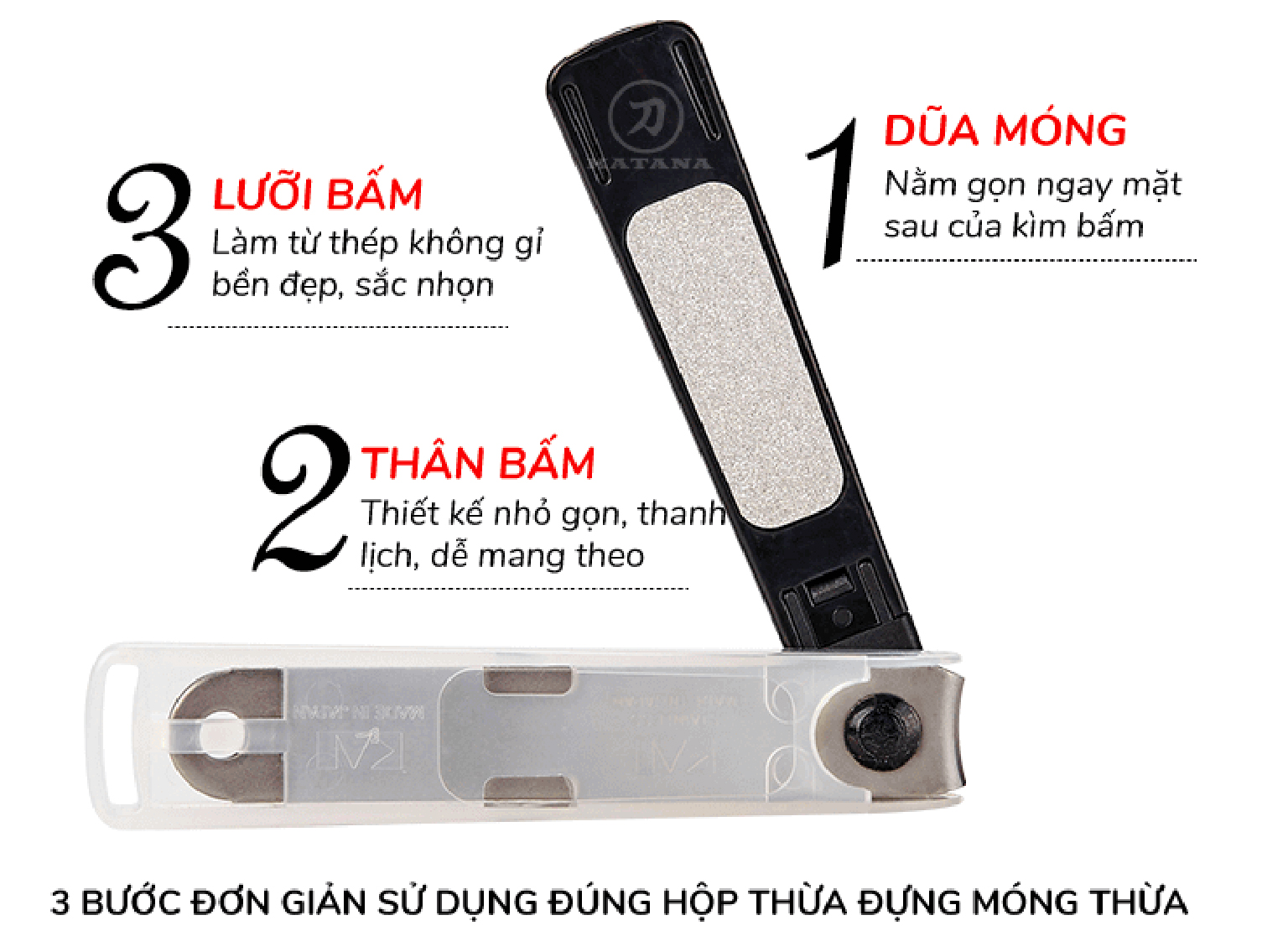 - Cấu tạo lưỡi cắt sắc, bén với tay cầm gọn và dễ sử dụng. đặc biệt, phần bọc nhựa được thiết kế dùng để làm nơi chứa móng tay trong khi cắt, bấm nên rất gọn gàng và sạch sẽ.