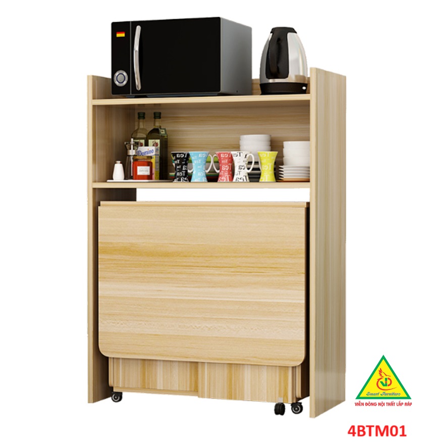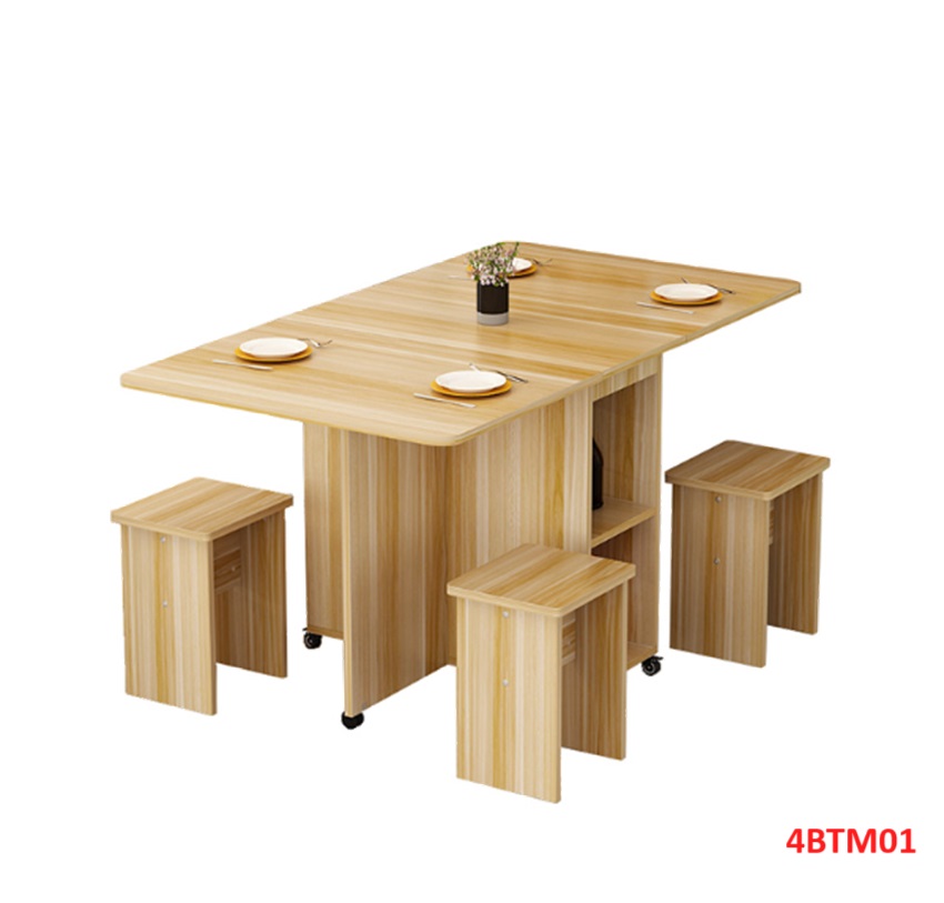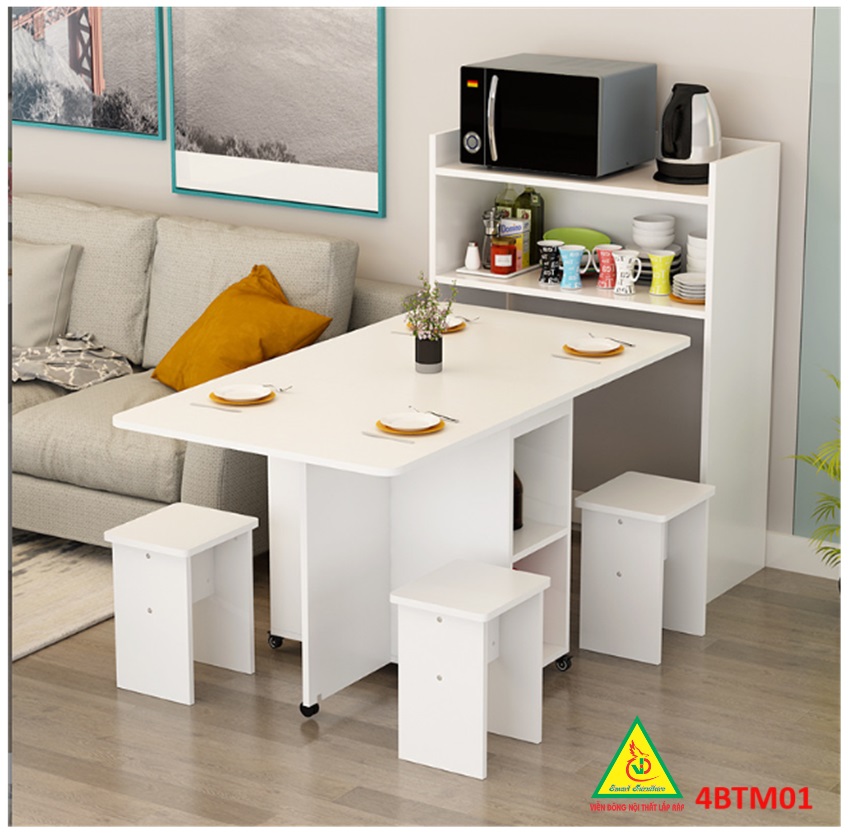 Bàn ăn gấp gọn thông minh Với các gia đình có diện tích phòng ăn không lớn lắm thì Bàn ăn gấp gọn này chính là sự lựa chọn lý tưởng nhất. Bàn ăn có kích thước nhỏ gọn, kết cấu thông minh có thể gấp gọn lại khi không sử dụng tiết kiệm diện tích. Bàn được làm bằng gỗ công nghiệp MDF cao cấp phủ melamine láng mịn, tính thẩm mỹ cao thu hút được sự chú ý của khách hàng. Tích hợp 3 in 1: Bàn, Tủ và Kệ thật Sang - Chảnh - Đẳng Cấp Dù nhà lớn hay nhỏ thì chiếc Bàn Ăn Thông Minh sẽ làm không gian gọn gàng hơn, thoáng hơn và đẹp hơn.