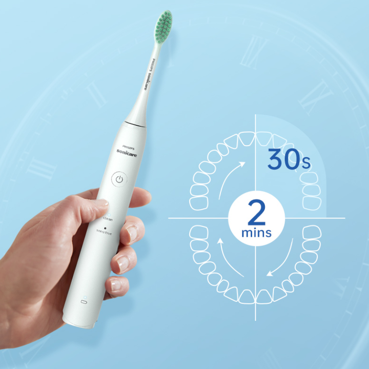 - Philips Sonicare được trang bị Smartimer đảm bảo bạn chải răng đúng thời gian 2 phút. giúp bạn biết được thời gian chuyển vùng chải răng, cảm biến áp sẽ nhắc nhở bạn nhẹ nhàng để không làm “tổn thương” răng của mình.