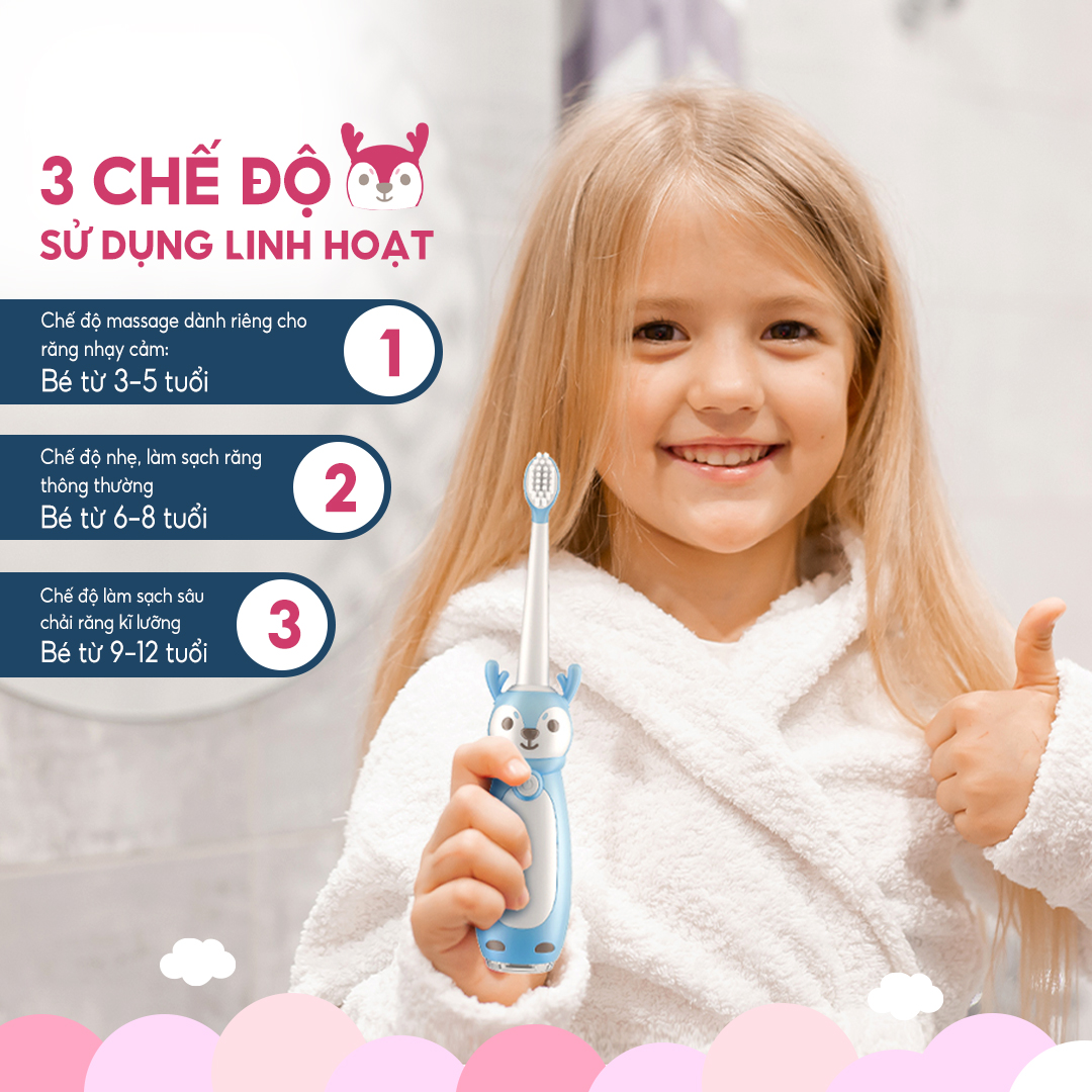 3 chế độ điều chỉnh thông minh, phù hợp với mọi nhu cầu làm sạch răng cho bé.