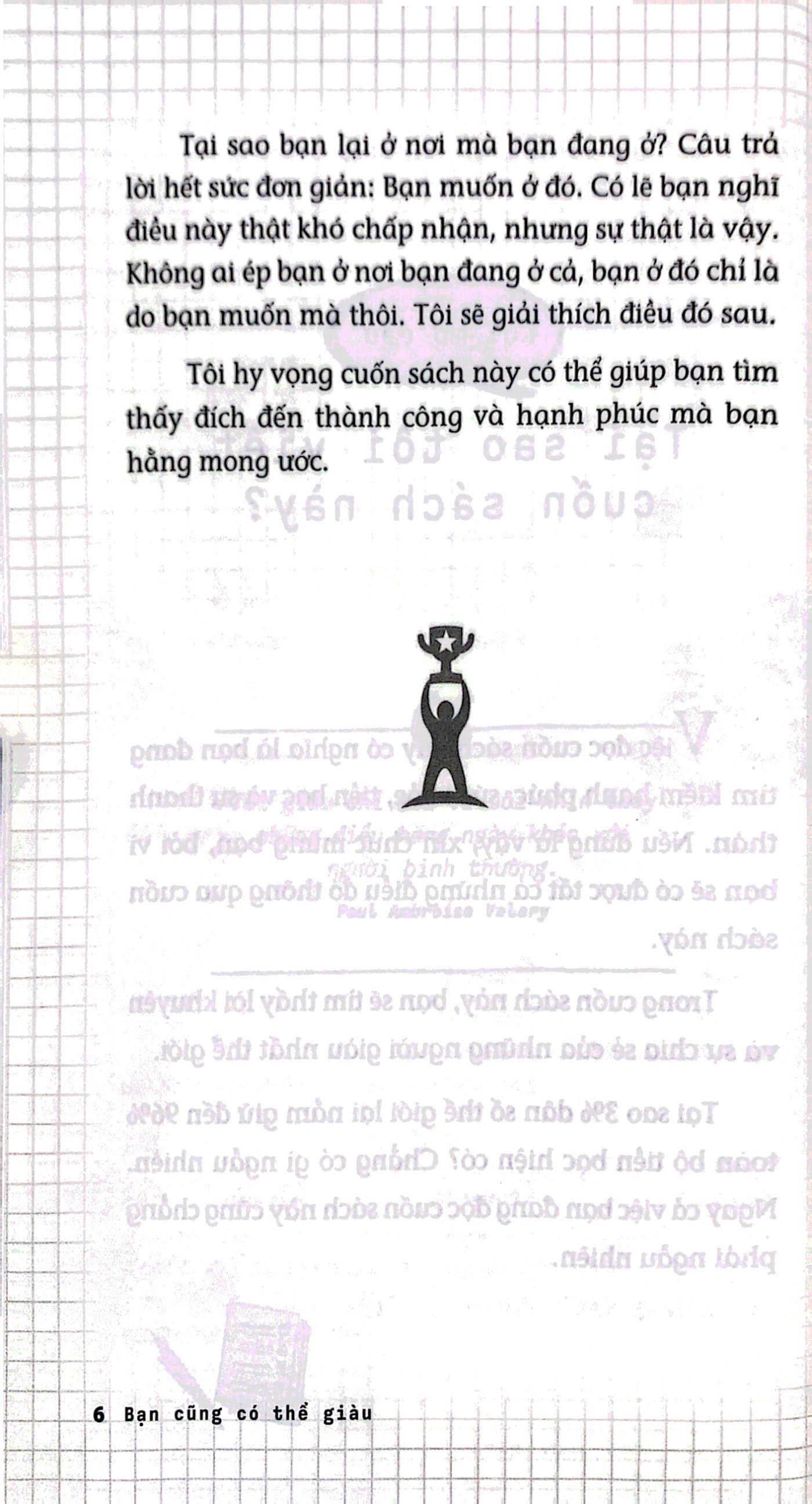 Bạn Cũng Có Thể Giàu Khoảng 90% dân số thế giới làm những công việc họ không thích và sống cả đời trong thiếu thốn. Đã đến lúc bạn phải biết đến các nguyên tắc mà những người thành công nhất thế giới áp dụng. Môi trường sống và những người bạn đang giao tiếp nói lên phong cách lẫn thành tựu của bạn. Sách Bạn cũng có thể giàu sẽ giúp bạn thoát khỏi tình cảnh khốn khó và tuyệt vọng; bắt đầu hành trình hướng đến, sự bình yên, giàu có, hạnh phúc và an nhàn. Mỗi người đều có sứ mệnh độc đáo trong cuộc đời này. Sứ mệnh của bạn chính là giúp bản thân và những người xung quanh thực hiện ước mơ.